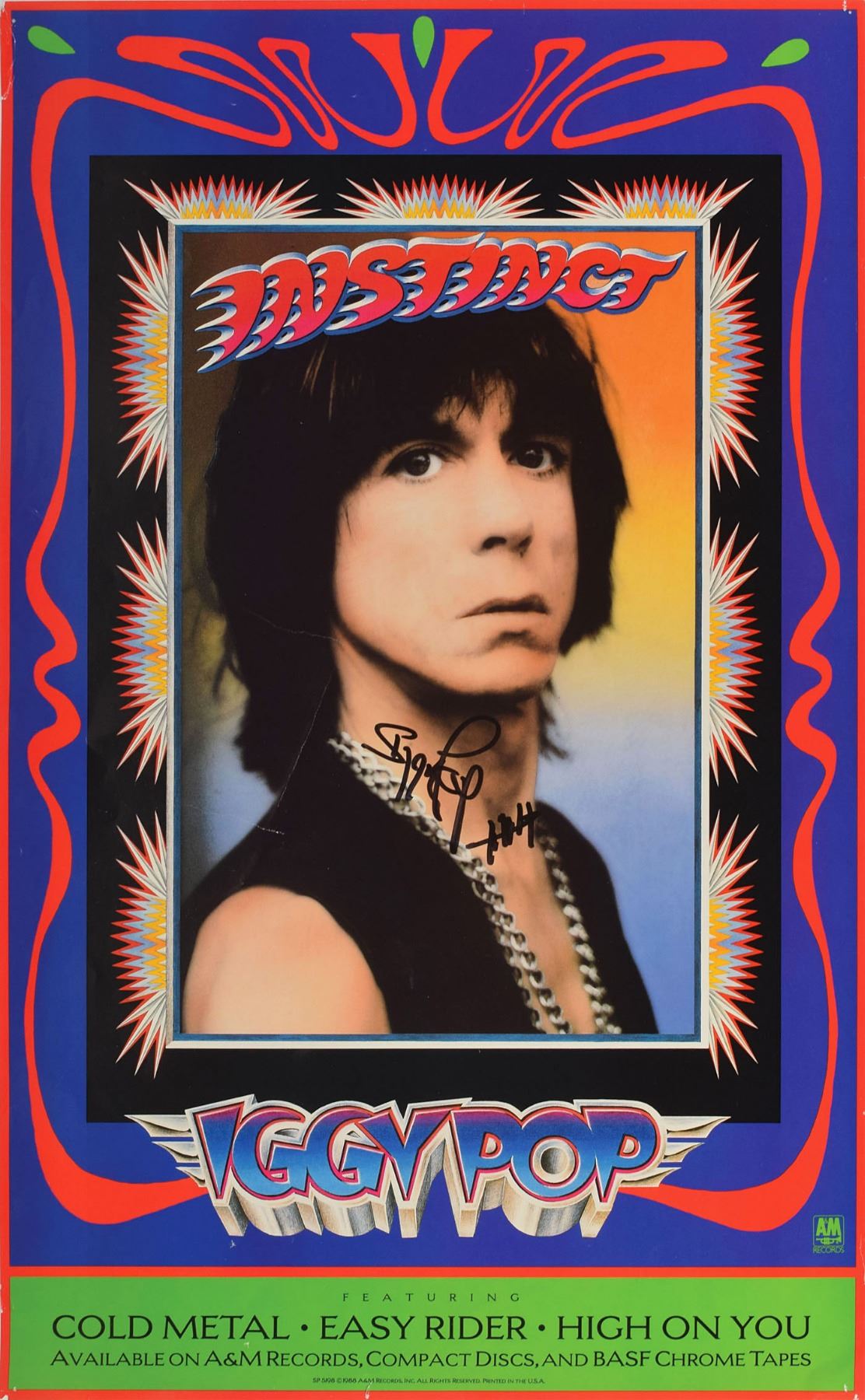Original color 17 x 27.25 first printing promotional poster for Iggy Pop's ninth studio album Instinct, showing Iggy as he's pictured on the front cover, signed in black felt tip. In very good to fine condition, with creases left of signature, a small tear to bottom edge, and tack holes to the corners.