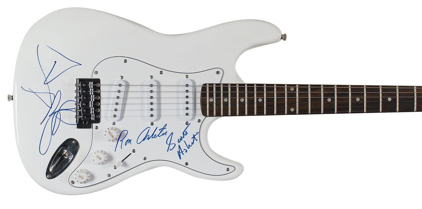 White-bodied Stedman Pro ‘stratocaster-style’ electric guitar, signed on the body in blue felt tip by Iggy Pop and on the white pickguard in blue felt tip by Ron Asheton and Scott Asheton. In fine condition. Oversized.