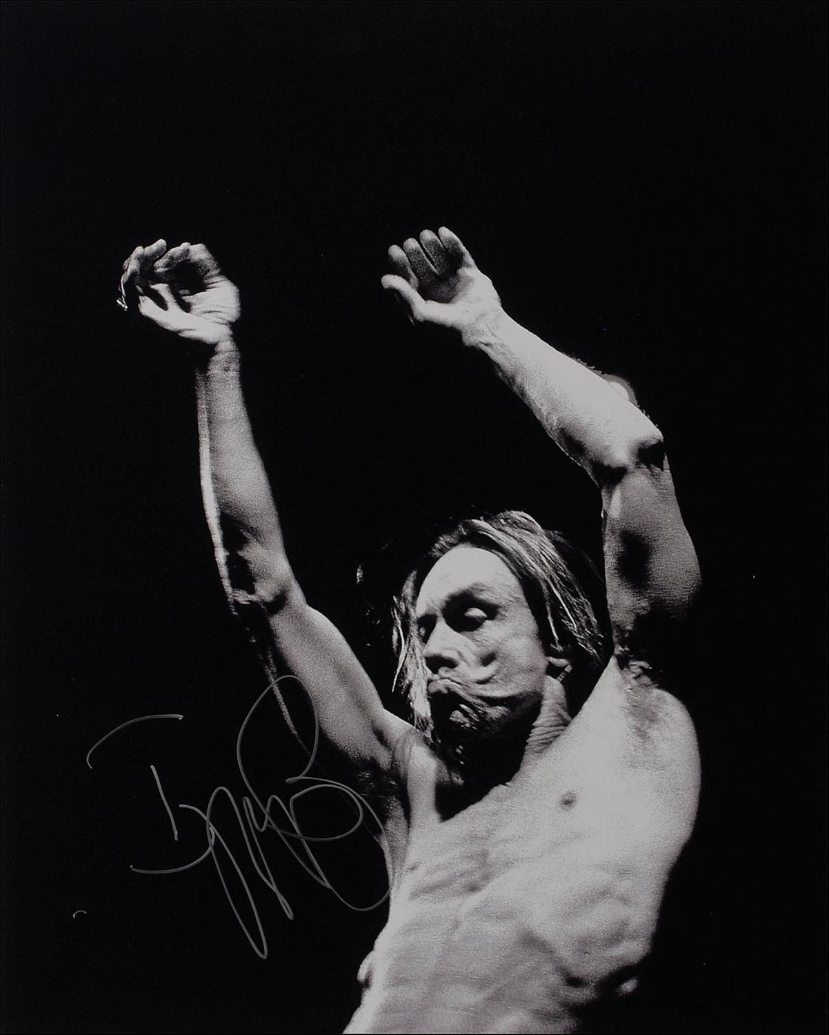 Satin-finish 16 x 20 photo of the singer in the throes of performance, signed boldly in silver ink. In fine condition, with some very light surface impressions.