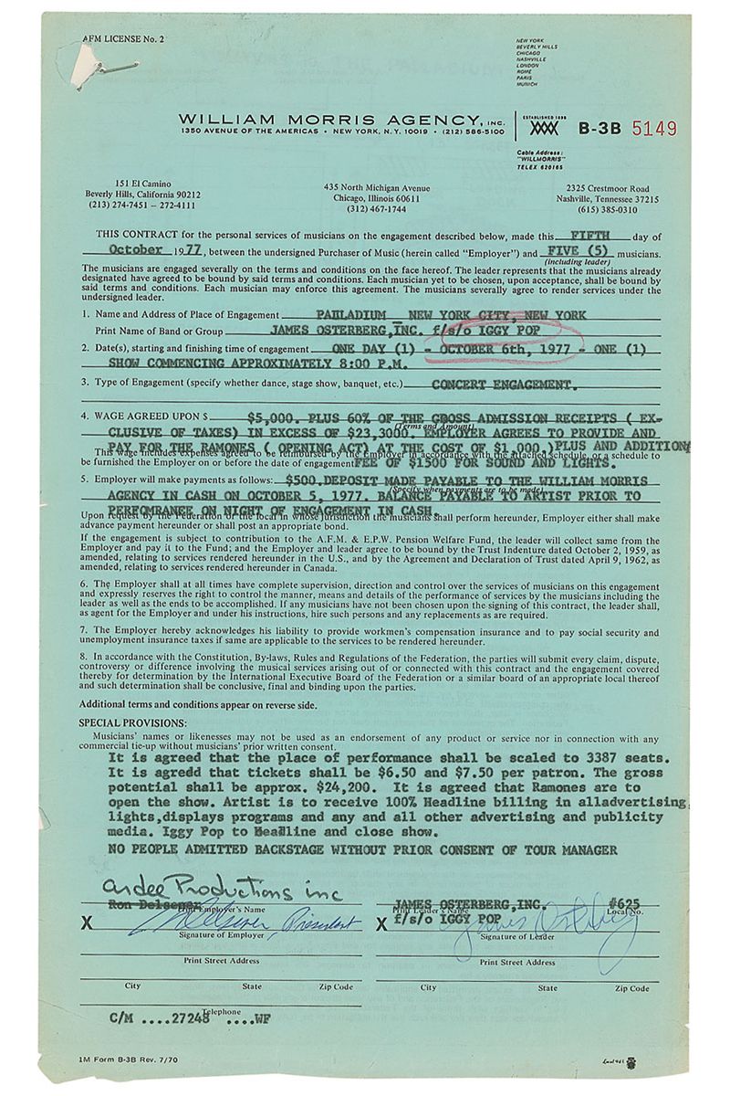 DS, signed “James Osterberg,” one page, 8.5 x 14, October 5, 1977. William Morris Agency contract between the New York’s Palladium venue and Iggy Pop for an “October 6th, 1977…concert engagement” in exchange for “$5,000 plus 60% of the gross admissions receipts…in excess of $23,300.” The employer also “agrees to provide and pay for the Ramones (opening act) at the cost of $1000, plus…$1500 for sound and lights.” Signed at the conclusion in blue ballpoint by Pop, using his legal name, and the promoter. Document bears a couple original red pencil notations to the top, and a map with directions to the Palladium attached with a staple. In very good condition, with scattered edge tears, toning, and creases.