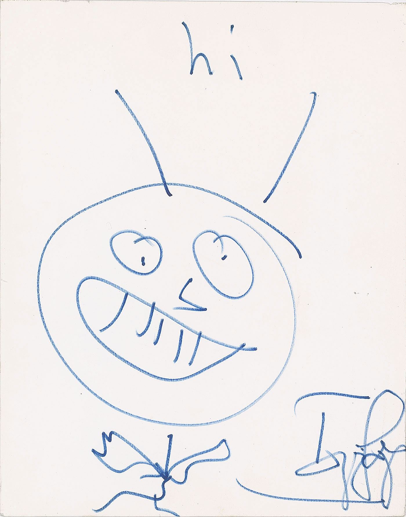 Original felt tip sketch of a stick figure character with large smiling face and two antennae on a white 11 x 14 sheet, signed in the lower right by Iggy Pop, who adds "hi" above the sketch. In fine condition.