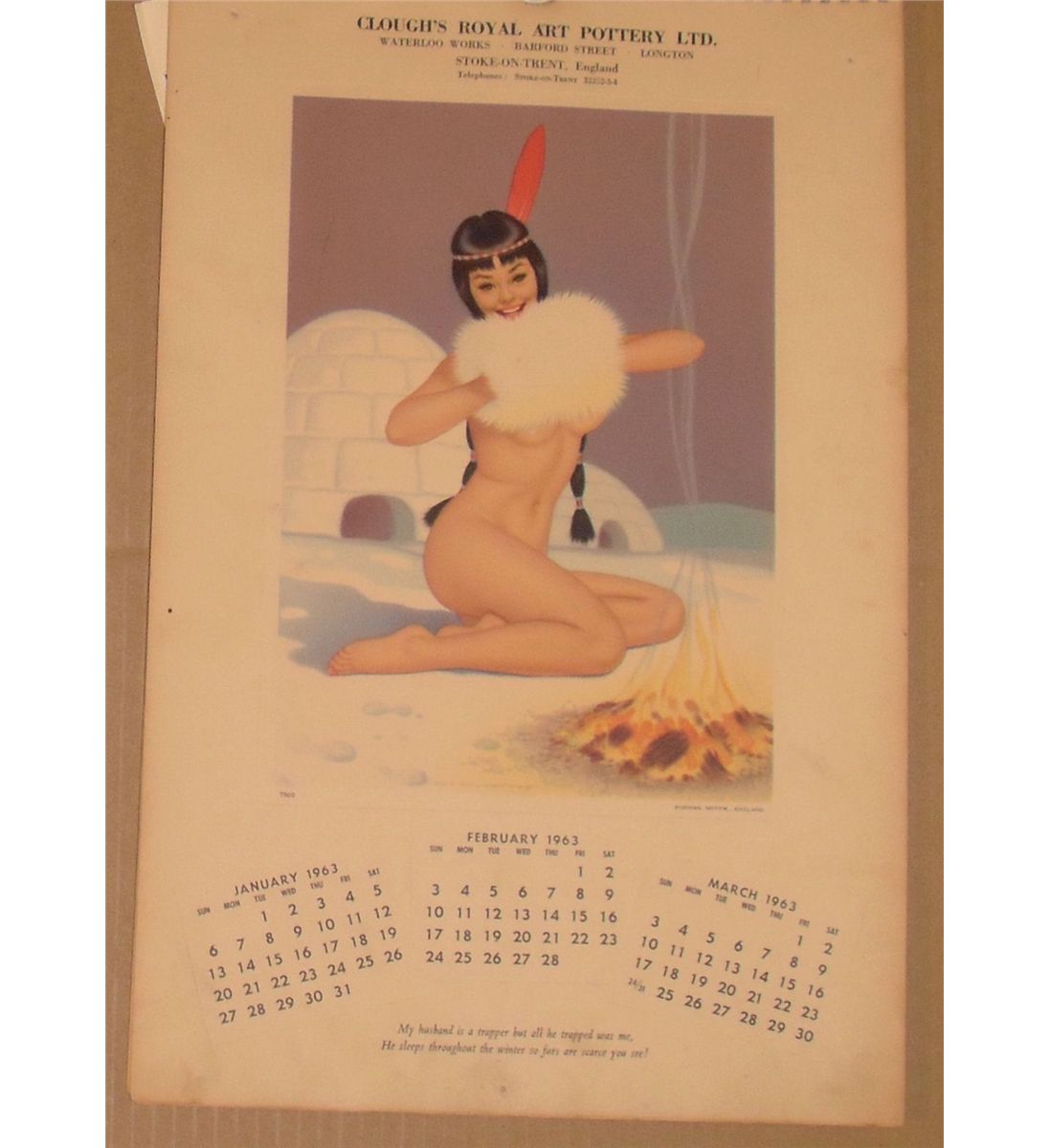 1963 unframed pin-up girl; you can use it as is, or frame it; lovely delicious colours, a delightful old image on yellowing about 14 high x 9 plus inches paper like an American "Indian" Native American, Inuit igloo story fantacy art; great for man cave; drawer, wall, or secret area or gift for ladies' too as tasteful composition; you may consider to combine this one item with others during the next Saturdays January and February AOAV-Attics auctions to save even more; great for your collections or start one, or as a gift !!!