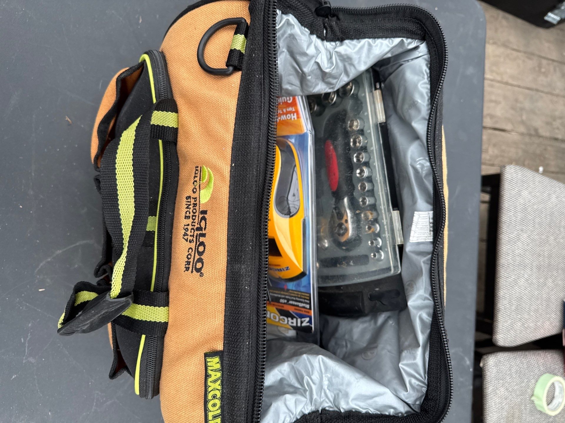 Igloo Max Cold cooler with various hand tools inside. SOCKET SET AND STUD FINDER BRAND NEW