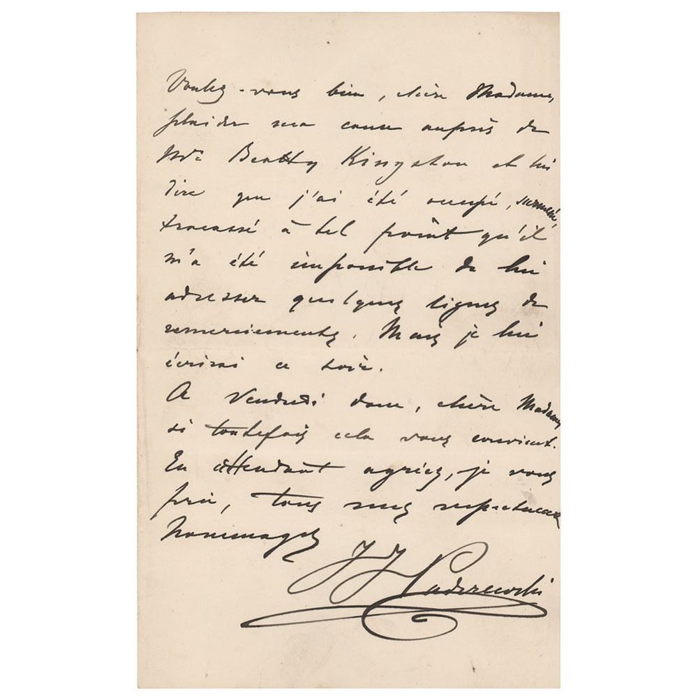 ALS in French, signed “I. J. Paderewski,†two pages on two adjoining sheets, 5 x 8, no date. Untranslated handwritten letter by the great Polish pianist and politician. In fine condition.