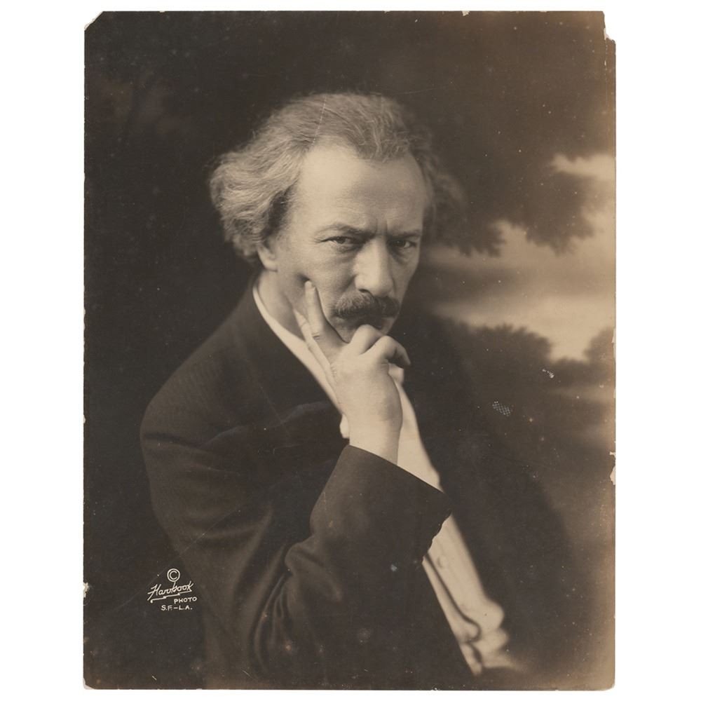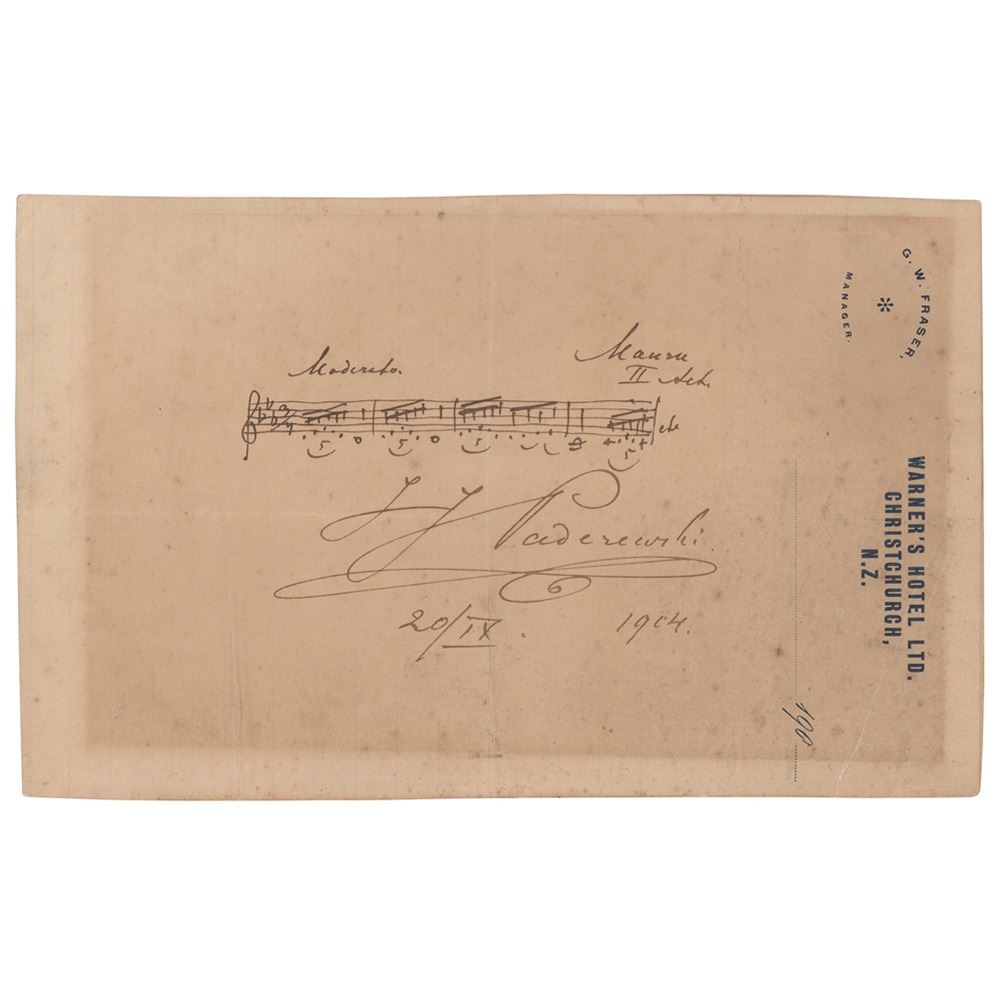AMQS on a 7.75 x 5 sheet of Warner's Hotel stationery, signed below in fountain pen, "I. J. Paderewski, 20/IX 1904." Paderewski pens four bars from Act II of his opera "Manru," penning the title above. Affixed to a same-size sheet and in very good to fine condition, with scattered light foxing, intersecting folds, and toning from prior display. Accompanied by a handsome unsigned original 7.25 x 9.25 portrait by Hartsook.