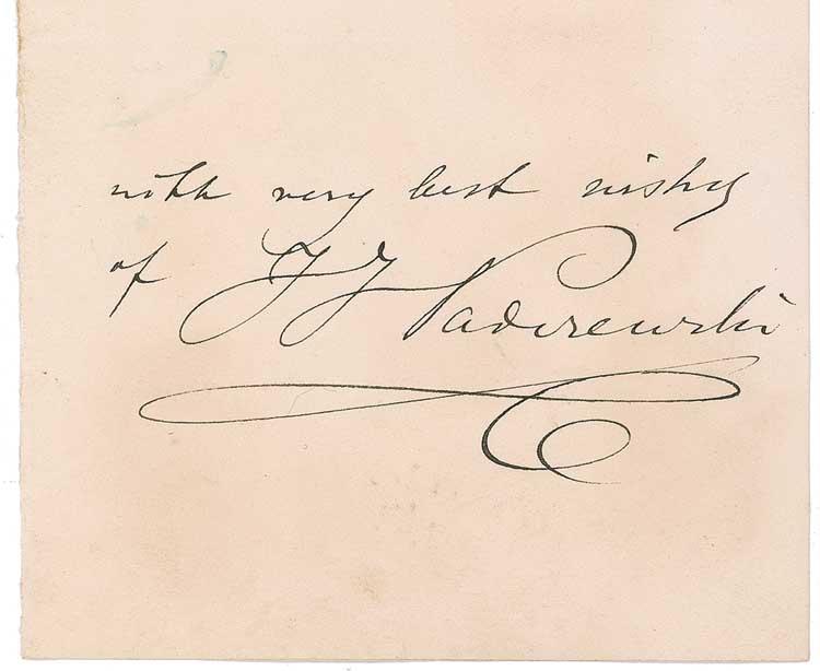 Ink signature, “With very best wishes of I. J. Paderewski,” on an off-white 4 x 6.25 sheet of stationery. In fine condition, with some scattered light toning. RRAuction COA.