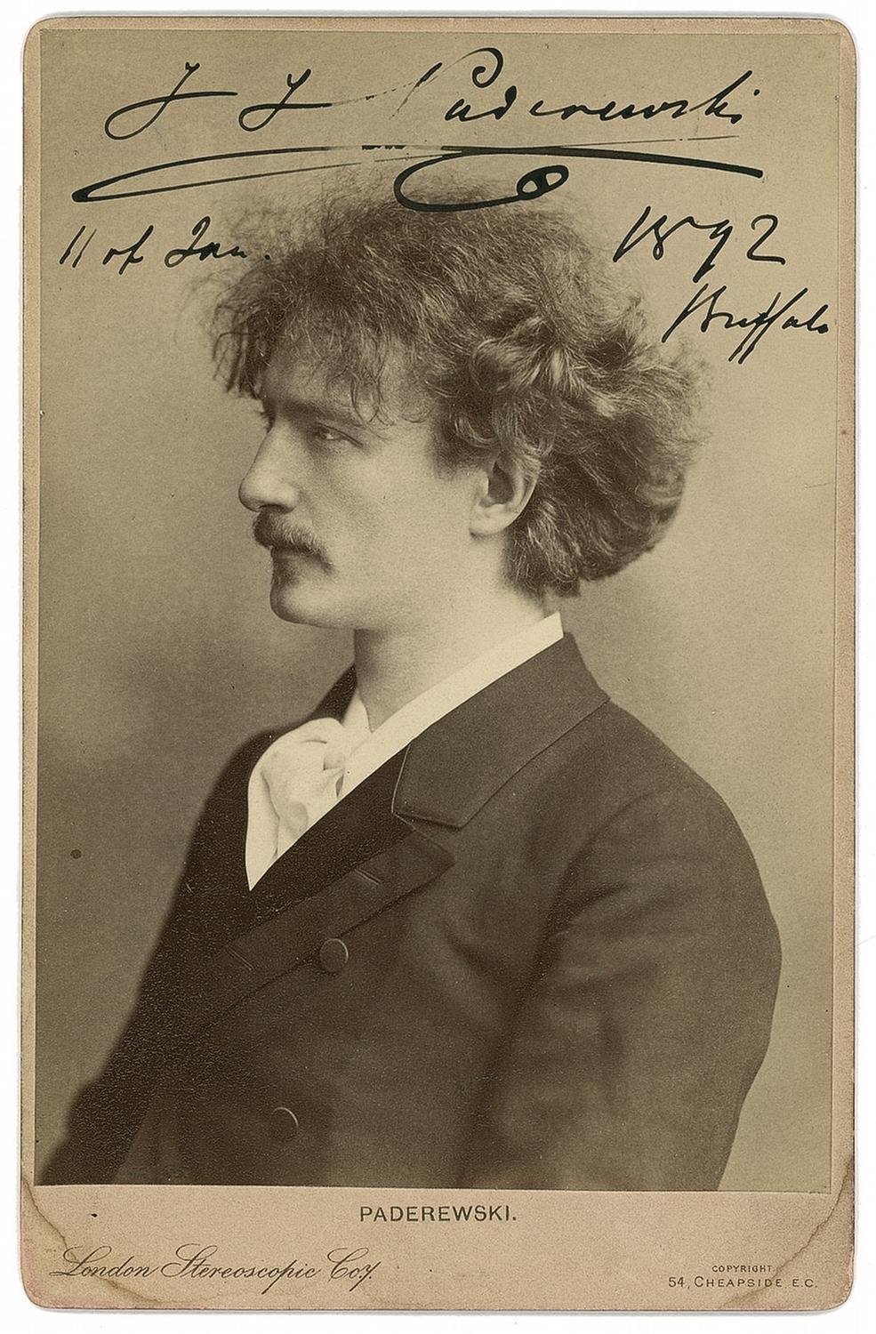Polish pianist, composer, and politician (1860–1941) whose abounding talent and personal magnetism made him one of the most popular virtuosi of all time. Wonderful 4.25 x 6.5 cabinet portrait by the London Stereoscopic Company, showing the wild-haired pianist in profile, signed in fountain pen above his head, “I. J. Paderewski, 11 of Jan 1892, Buffalo.” Small stains to lower corner tips, some faint silvering to the image, and slight skipping to the “P” in the signature, otherwise fine condition. A well-preserved example. Provenance: The Barry Hoffman Collection.
