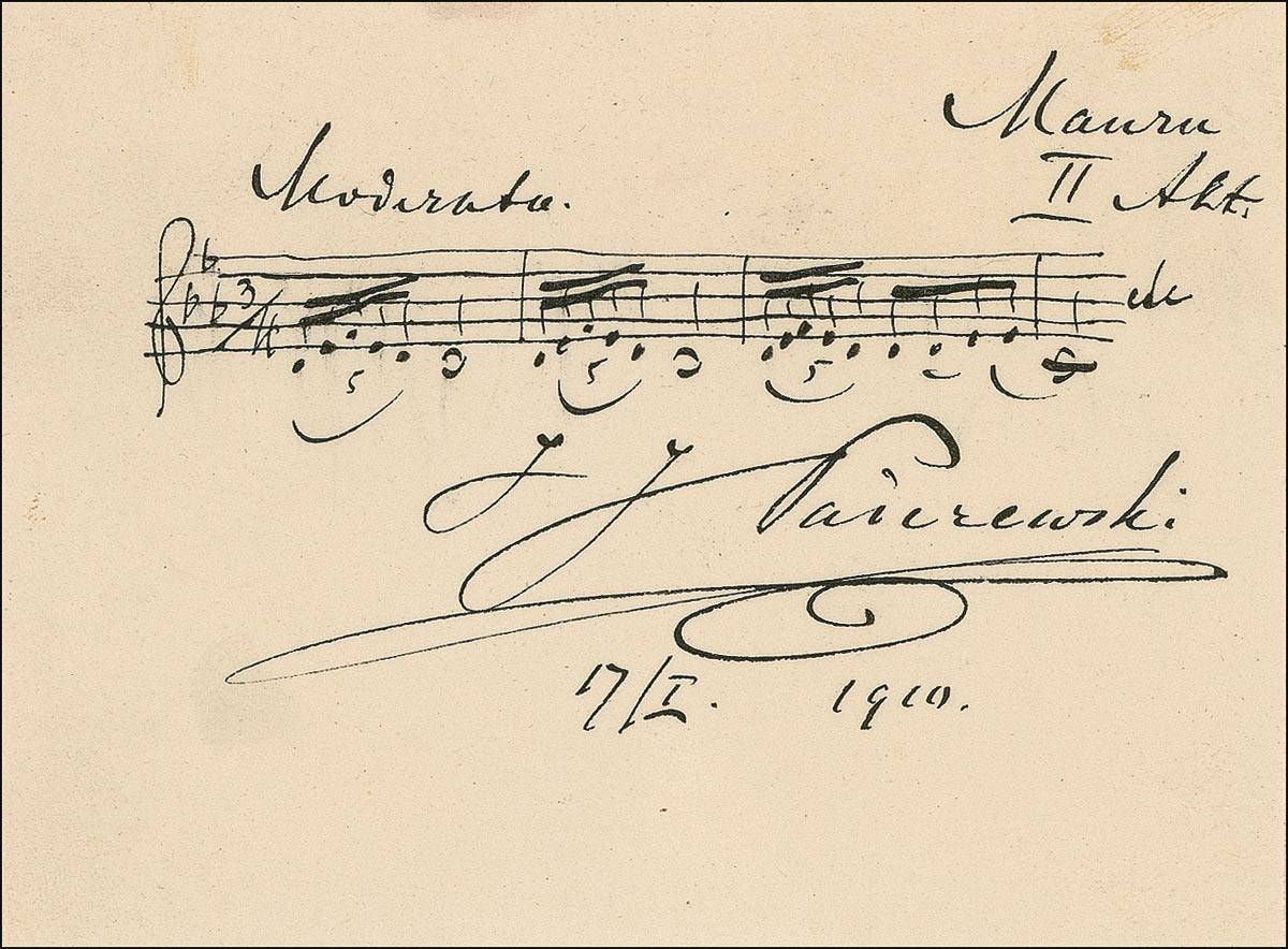 Polish pianist, composer, and politician (1860–1941) whose abounding talent and personal magnetism made him one of the most popular virtuosi of all time. AMQS on an off-white 4.5 x 3.25 sheet. Paderewski Pens four intricate bars of music, labeled at the top, “Moderata,” and “Mauru,” and signed at the conclusion, “I. J. Paderewski, 17/I 1910.” In fine condition. The item has been removably archivally sleeved in acid free Mylar