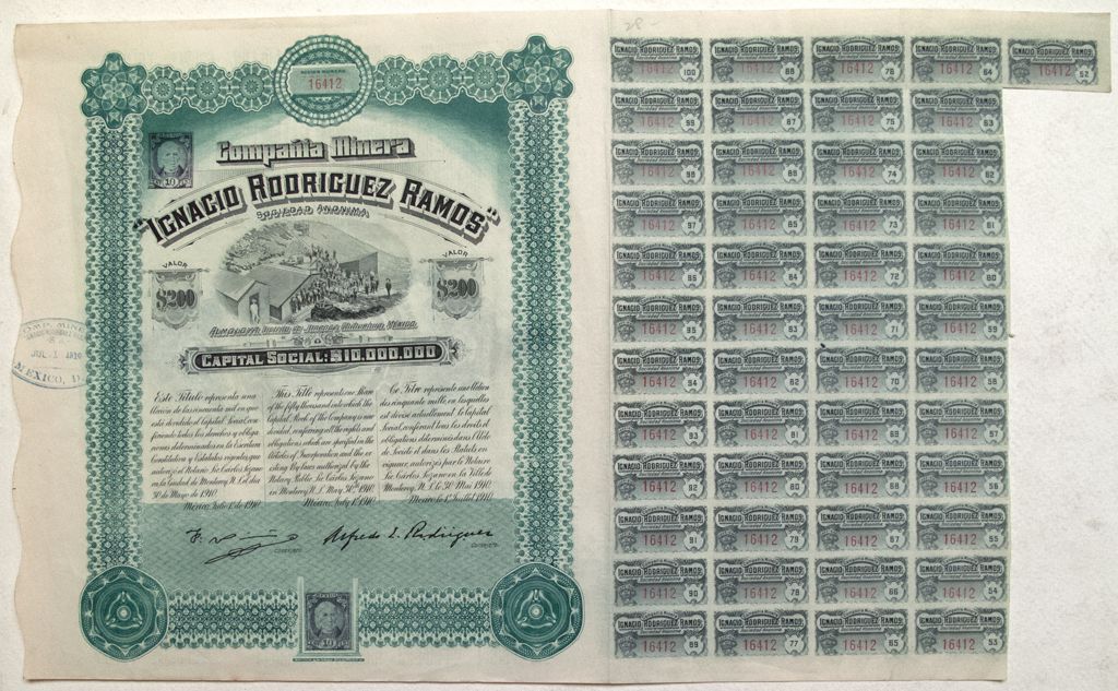 1910, Mexico. Certificate for 1 share. Green border with black text on white paper. Coupons numbered 52-100 still attached (unusual). Engraved vignette at top center of some workers standing outside some buildings at the entrance to a mineshaft. Partial coupons attached to the right side. In extremely fine condition.