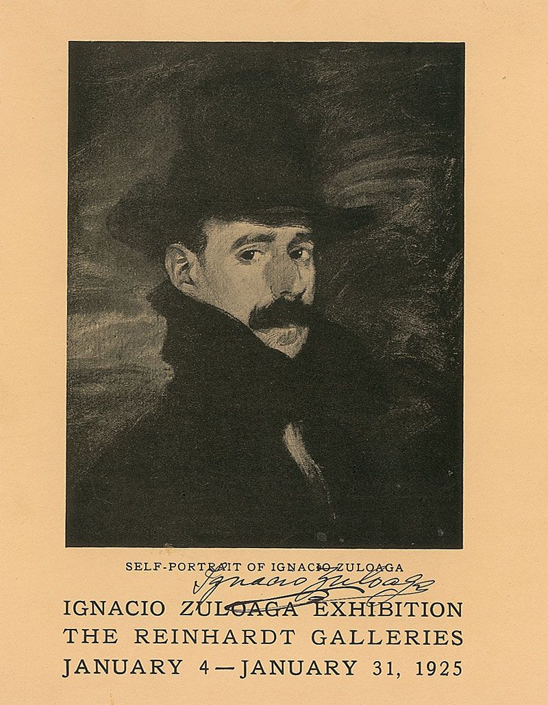Spanish painter (1870–1945). Program page from a 1925 Zuloaga exhibit catalog, 6.5 x 8.25, featuring an image of Zuloaga’s self-portrait, signed under the image in black ink. In fine condition, with a trimmed bottom edge.