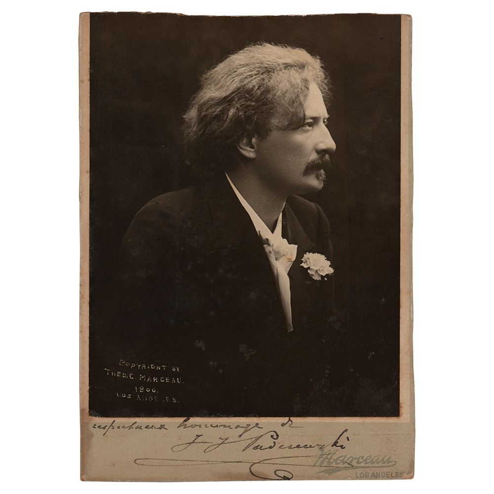 Polish pianist, composer, and politician (1860-1941) whose abounding talent and personal magnetism made him one of the most popular virtuosi of all time. Vintage matte-finish 4.25 x 5.75 profile portrait photo of Ignacy Jan Paderewski by Theodore Marceau from 1900, signed in the lower border in fountain pen, "respectueux hommage de I. J. Paderewski." In very good to fine condition, with a trimmed top edge, light spotting to the image, and small stains to the bottom border.