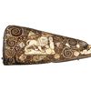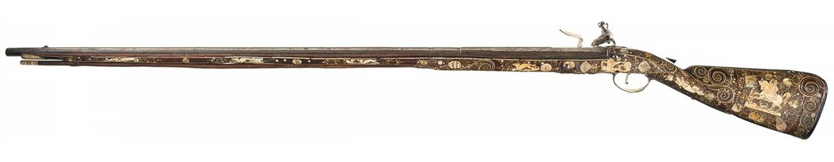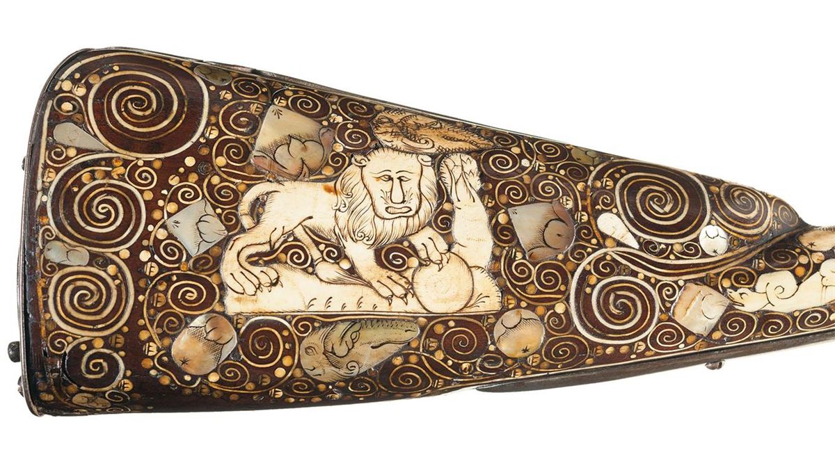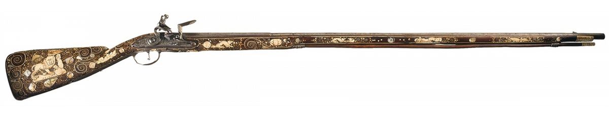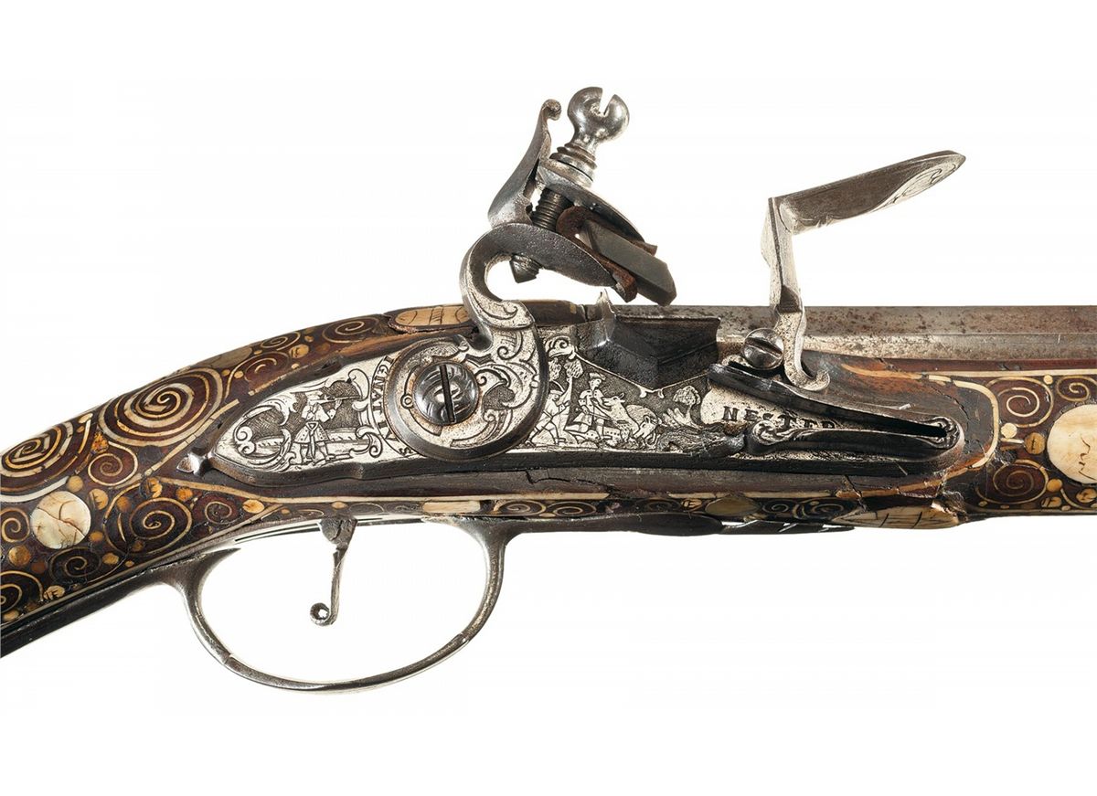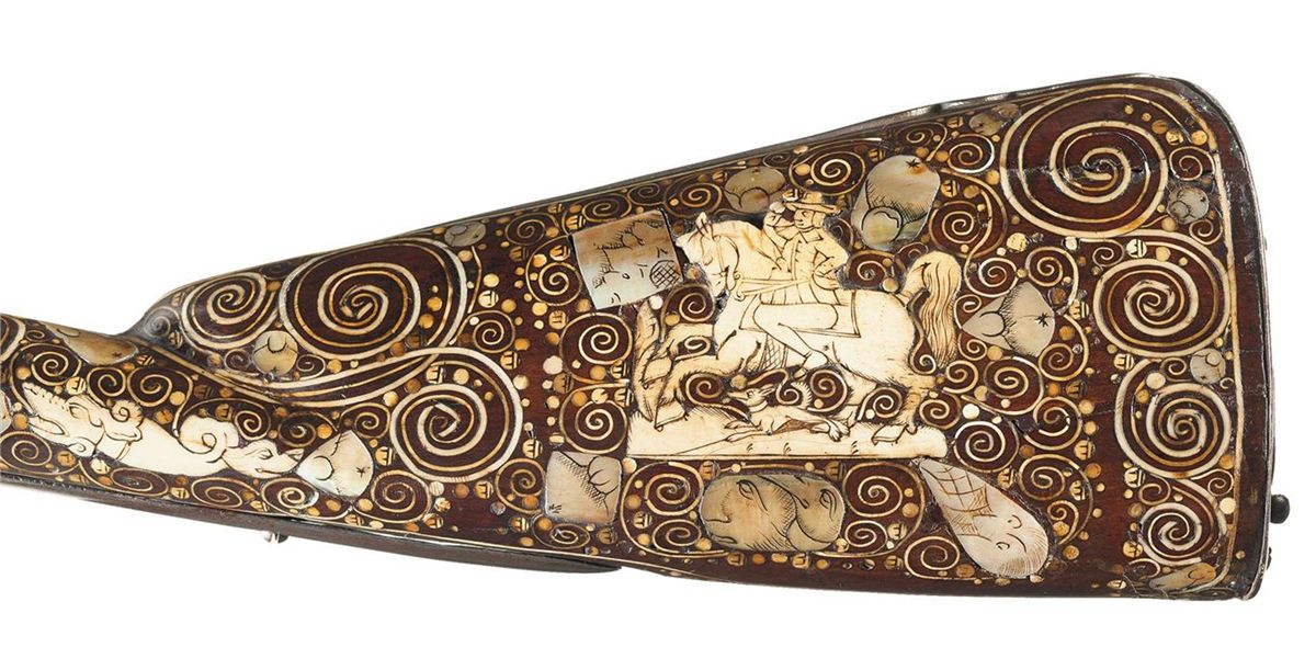 Fitted with a blade sight, with light scroll engraving along the length of the barrel, with a pair of hunting scenes on the lock, which is marked "IGNATIVS" behind the hammer and "NESTER" under the frizzen spring, and extensive chiseled metal work on the frizzen and hammer. Smooth full length stock, with a decorated bone forearm tip and a smooth steel buttplate with storage compartment. Extensive bone and horn inlays are present on the stock, with fine scroll patterns overall, panels of floral carved bone and pearl, four dog-shaped bone panels on each side of the forearm and another two on the wrist, and a large bone panel on each side of the butt, showing a lion on the right and a mounted hunter with dog on the left.