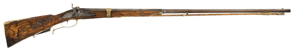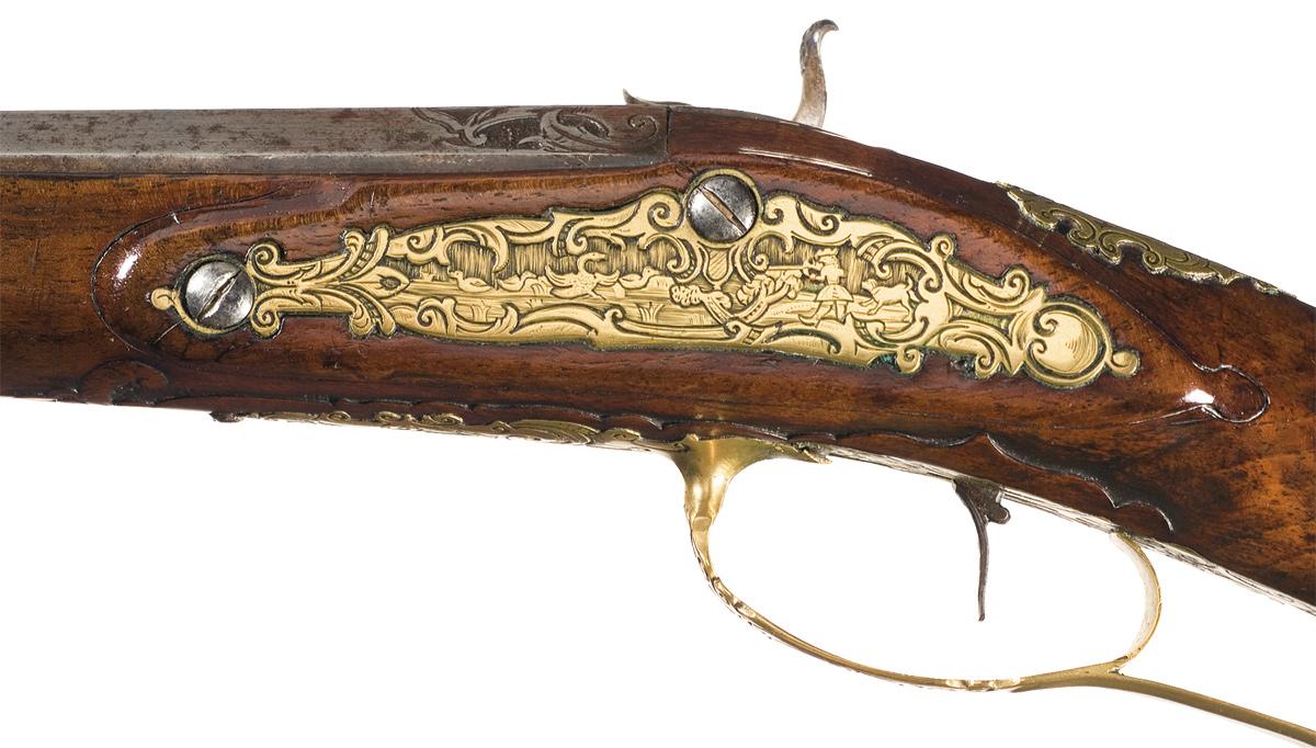 Fitted with a silver blade sight, decoratively inlaid near them muzzle, with a 1" wide engraved brass barrel band, an area of scroll engraving at the breech along with a golden proof stamp marked "crown/ IGNATI/ VS: NEST/ ER". The conversion bolster is set into the cut flashpan, with "IGNATIVS" engraved behind the hammer, "NESTER" toward the front and a pair of hunting scenes, showing a hunter on the plains with his dog behind the hammer, and a man in a wooded scene trying to lasso a deer ahead of the hammer. The brass triggerguard and reverse plate are engraved, with a marsh scene of a hunter taking aim on ducks on the plate and a running rabbit on the guard, along with more general engraving. Half length stock, with a brass tipped ramrod, engraved brass forearm tip and ramrod pipe, inscription plate marked "2" on the floral carved wrist, raised cheekpiece with engraved brass accent band, additional floral carving on the left side of the butt and an engraved buttplate with a scene of a man posing with his rifle on the heel.