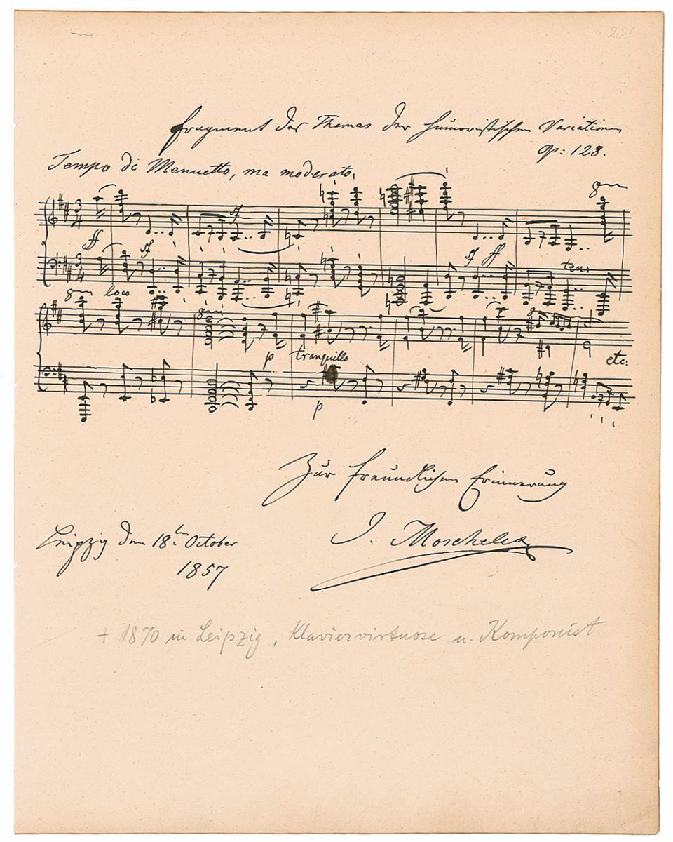 Bohemian composer and piano virtuoso (1794-1870), whose career after his early years was based initially in London, and later at Leipzig, where he succeeded his friend and sometime pupil Felix Mendelssohn as head of the Conservatoire. Handwritten musical manuscript on a 7.75 x 9.75 off-white sheet, signed at the bottom, “Zur freundlichen Erinnerung, J. Moscheles, Leipzig, 18th October 1857.” Moscheles pens 12 intricate bars of music in two systems, being “Fragment des Themas der humoristischen Variation op. 128.” The page is marked at the top, “Tempo di Menuetto, ma moderato.” A mild shade of toning, a bit heavier to the edges, a few wrinkles, and a pencil notation under signature, otherwise fine condition.