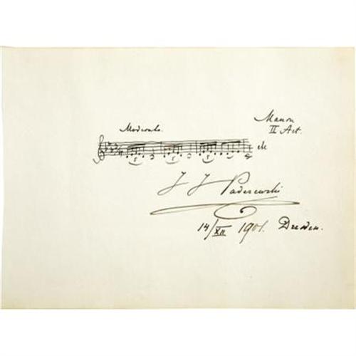 <B>Ignaz Paderewski Autograph Musical Quote Signed</B></I> “<I>I J Paderewski</B></I>”. One page, 7.25” x 5.5”, with musical notation from the second act of his opera <I>Manru</B></I> and dated December 14, 1901, Dresden, in fine condition. <I>Manru</B></I>, Paderewski’s sole opera premiered in Dresden in 1901 so there can be little doubt that the master penned this beautiful musical quote around that time. The paper has slightly toned, else the ink is bright and in fine condition.<BR><BR><BR><b>Shipping:</b> Flat Material, Small (<a target="_blank" href="http://www.heritageauctions.com/common/shipping.php">view shipping information</a>)