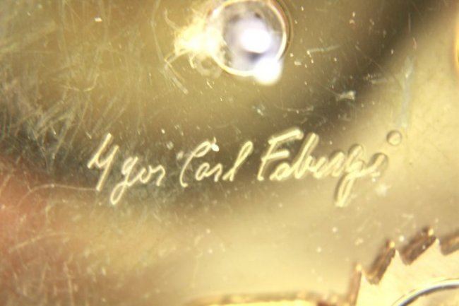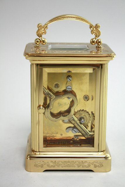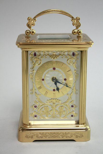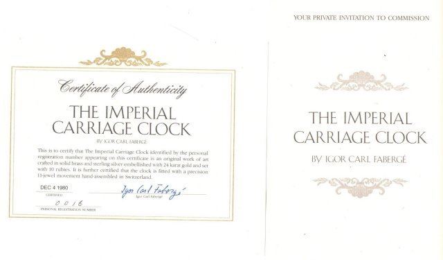 24k gold & silver with rubies. Igor Carl Faberge, Imperial Carriage Swiss mantle clock. Approx. 4 1/2" H x 3" W x 2 3/4" D. Approx. 5 1/2" tall with handle. With certificate of authenticity.
