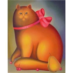 CAT WITH CHERRIES, color screenprint, signed in pencil, numbered edition 175, image 34 1/2 x 27 1/2", full margins. STARTING BID $20. ESTIMATE $20 TO $1000
