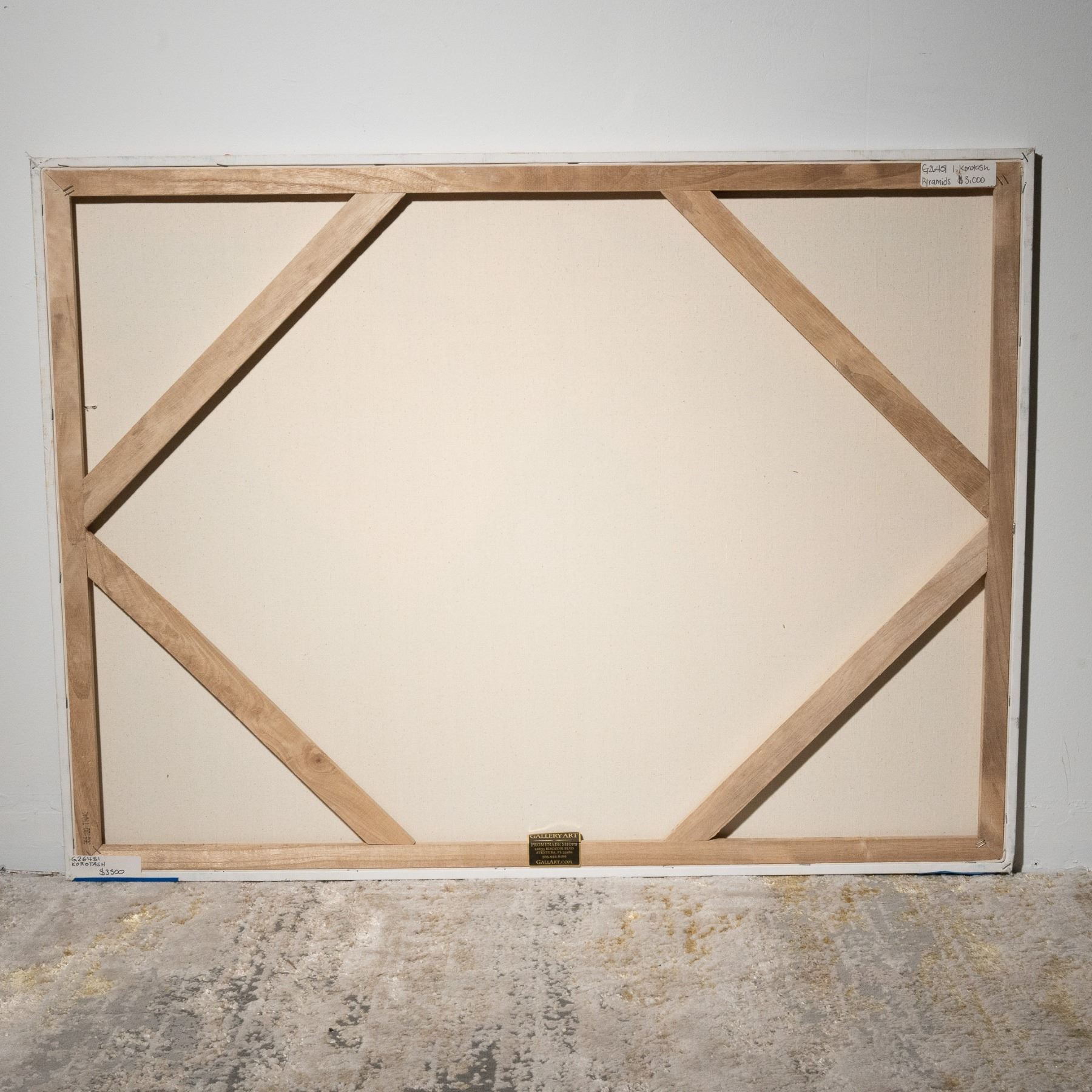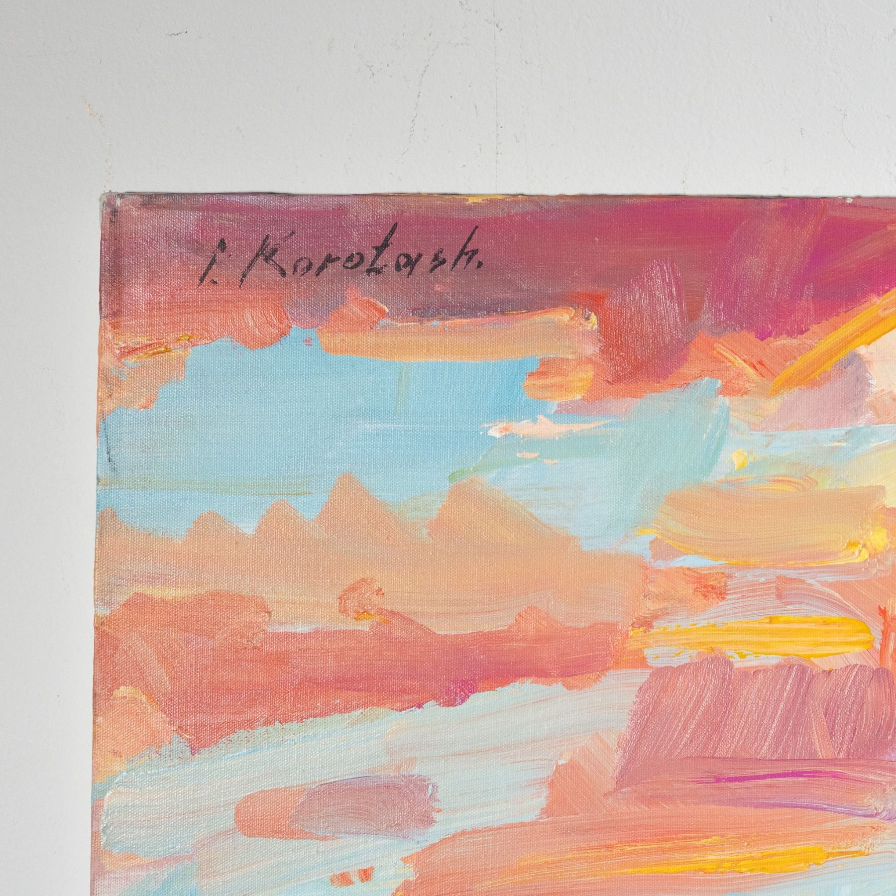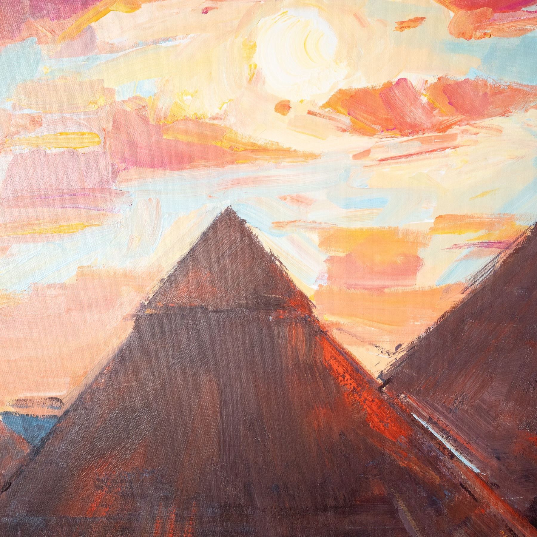 A striking acrylic painting on canvas by Ukrainian artist Igor Korotash, depicting the pyramids under a radiant sunset sky. The composition is infused with expressive brushwork and a rich palette of warm oranges, yellows, and deep purples, lending the piece a sense of depth and atmosphere. The textured application of paint reflects influences of post-impressionism and expressionism, emphasizing movement and emotion. The artist's signature is located in the upper left corner. The verso bears a label identifying the title as Pyramids. This evocative work showcases Korotash's ability to capture both the majesty and mystique of ancient landmarks. Signature on upper left.