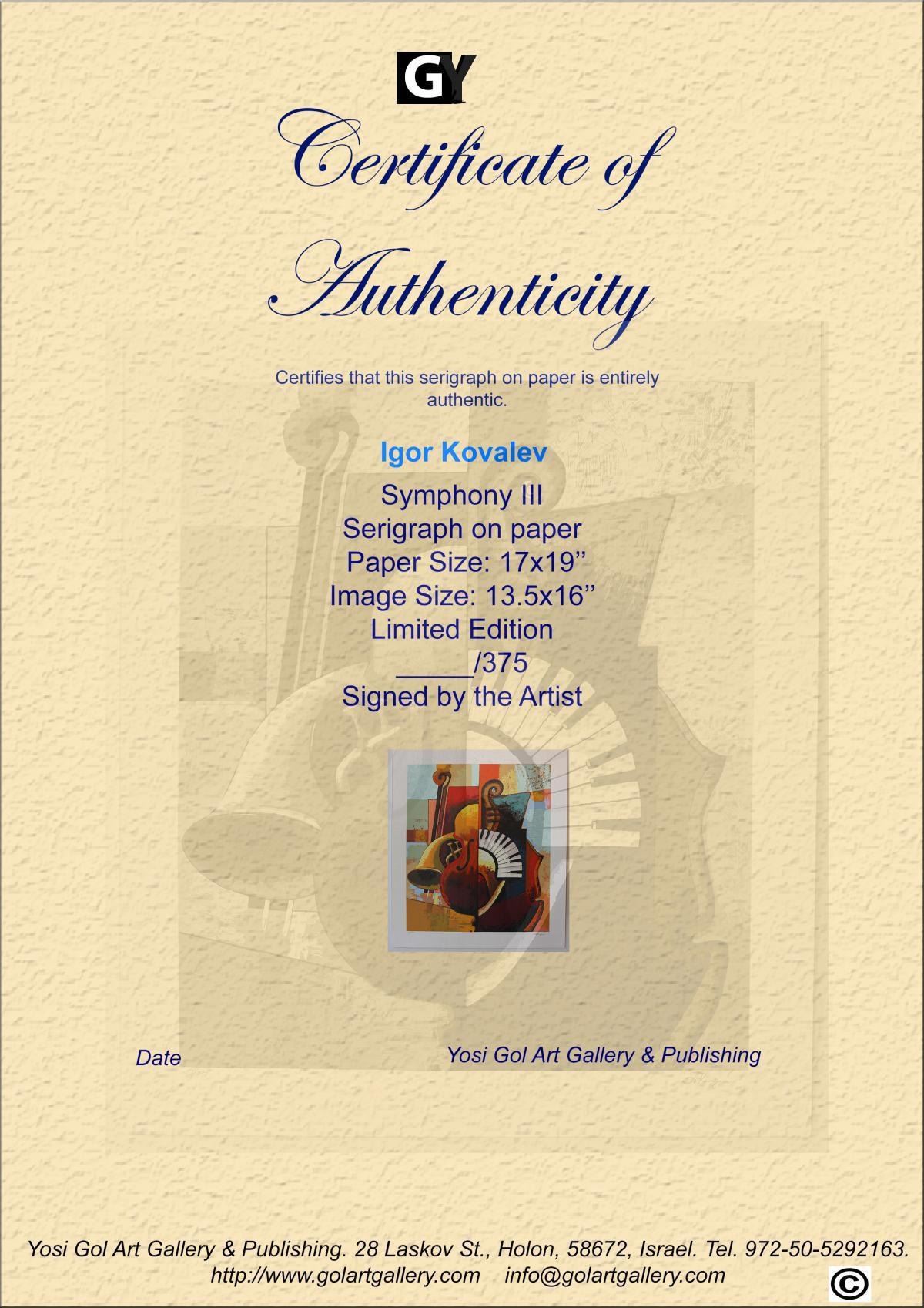 Artist: Igor Kovalev. Medium: Original Serigraph on Paper. Title: Symphony III. Size (Unframed): 19" x 17". Limited Edition: Edition of 375. Certificate of Authenticity: From the publisher.