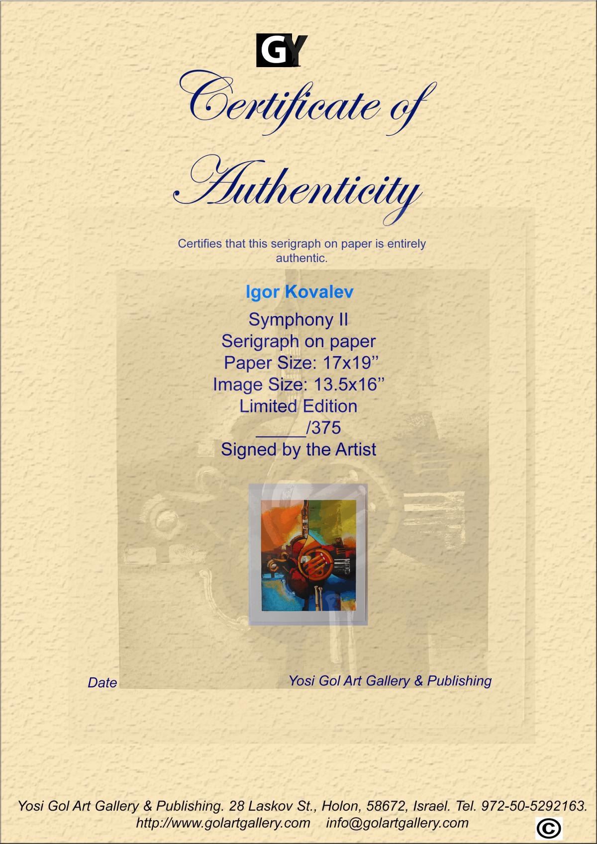 Artist: Igor Kovalev. Medium: Original Serigraph on Paper. Title: Symphony II. Size (Unframed): 19" x 17". Limited Edition: Edition of 375. Certificate of Authenticity: From the publisher. Reference# 200059.