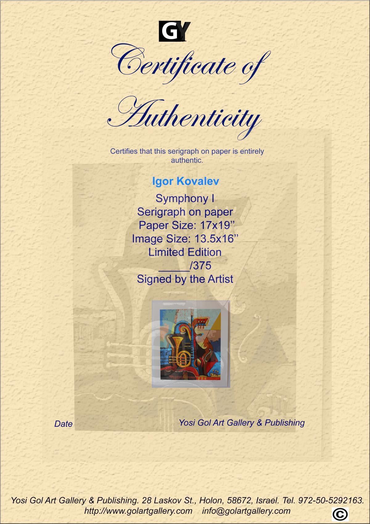 Artist: Igor Kovalev. Medium: Original Serigraph on Paper. Title: Symphony I. Size (Unframed): 19" x 17". Limited Edition: Edition of 375. Certificate of Authenticity: From the publisher.
