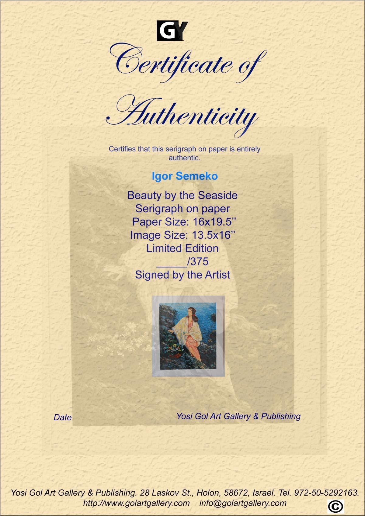 Artist: Igor Semeko. Medium: Original Serigraph on Paper. Title: Beauty by the Seaside. Size (Unframed): 19.5" x 16". Limited Edition: Edition of 375. Certificate of Authenticity: From the publisher.