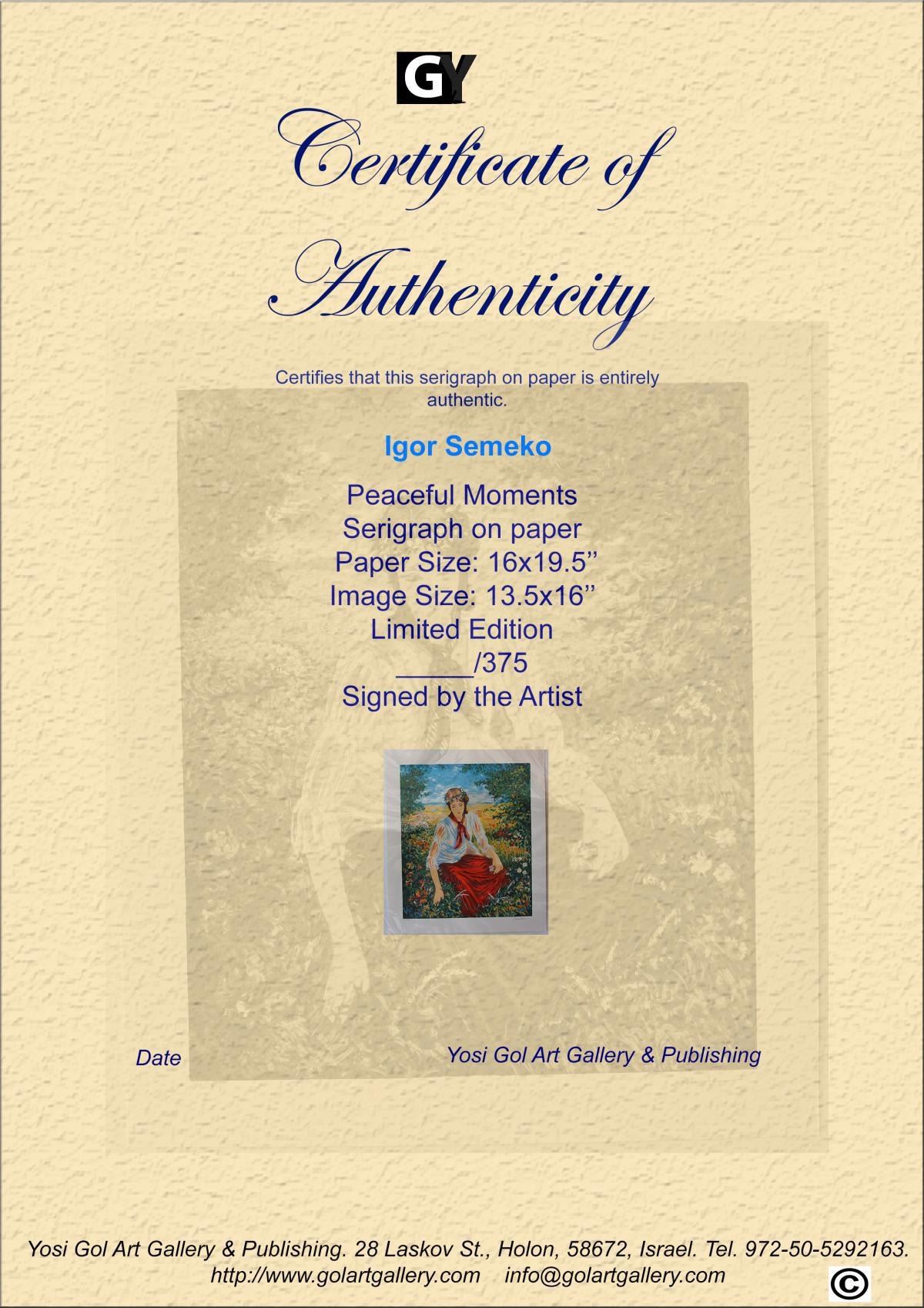 Artist: Igor Semeko. Medium: Original Serigraph on Paper. Title: Peaceful Moments. Size (Unframed): 19.5" x 16". Limited Edition: Edition of 375. Certificate of Authenticity: From the publisher. Reference# 200063.