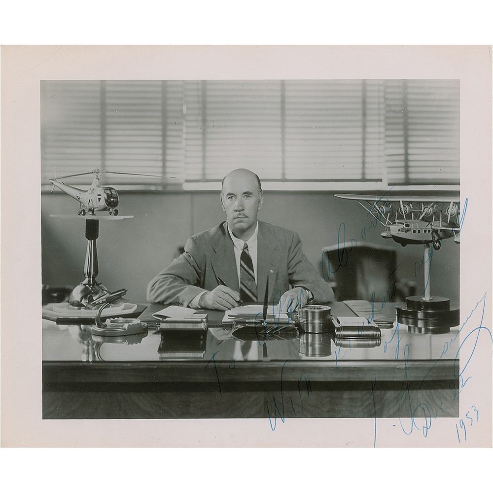 Vintage glossy 10 x 8.25 photo of Igor Sikorsky seated at his desk between models of a Sikorsky helicopter and flying boat, signed and inscribed in blue ballpoint, "To Alan Abrams, with kindest regards of I. Sikorsky, Dec. 22, 1953.” In fine condition, with scattered light creasing.