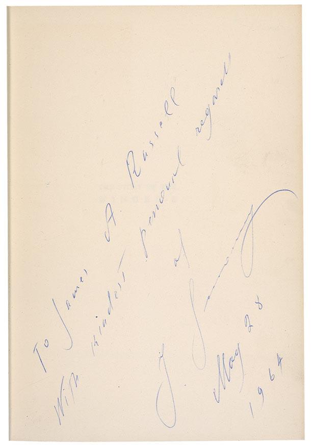 Pioneer aviation engineer (1889–1972) who developed the first four-engine airplane and the first modern helicopter to be put into widespread use. Two hardcover books, each signed on the first free end page by Sikorsky: The Story of the Winged-S (ins) and The Invisible Encounter (no dustjacket). In fine overall condition with light toning to the pages of wear to the first book’s dustjacket.