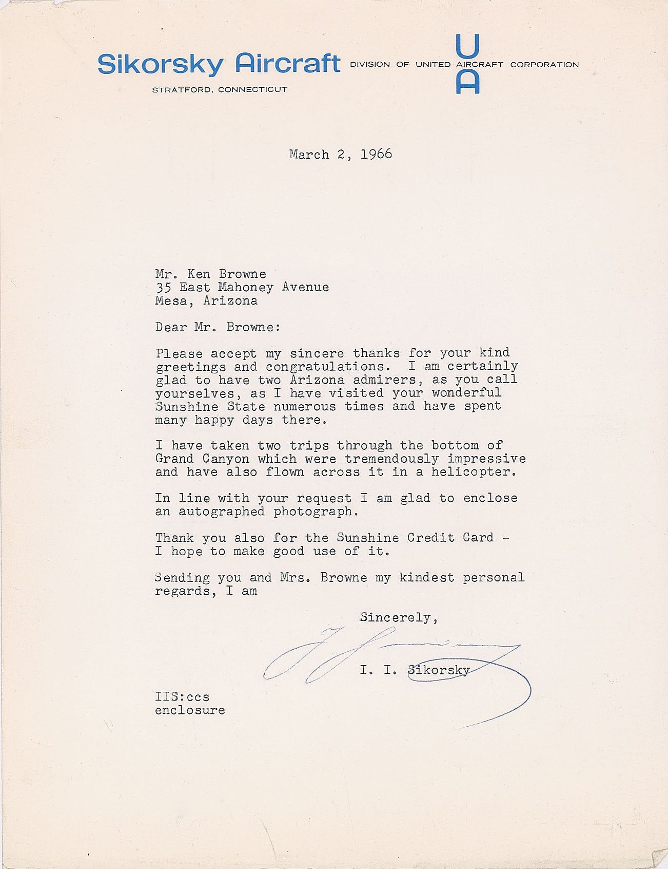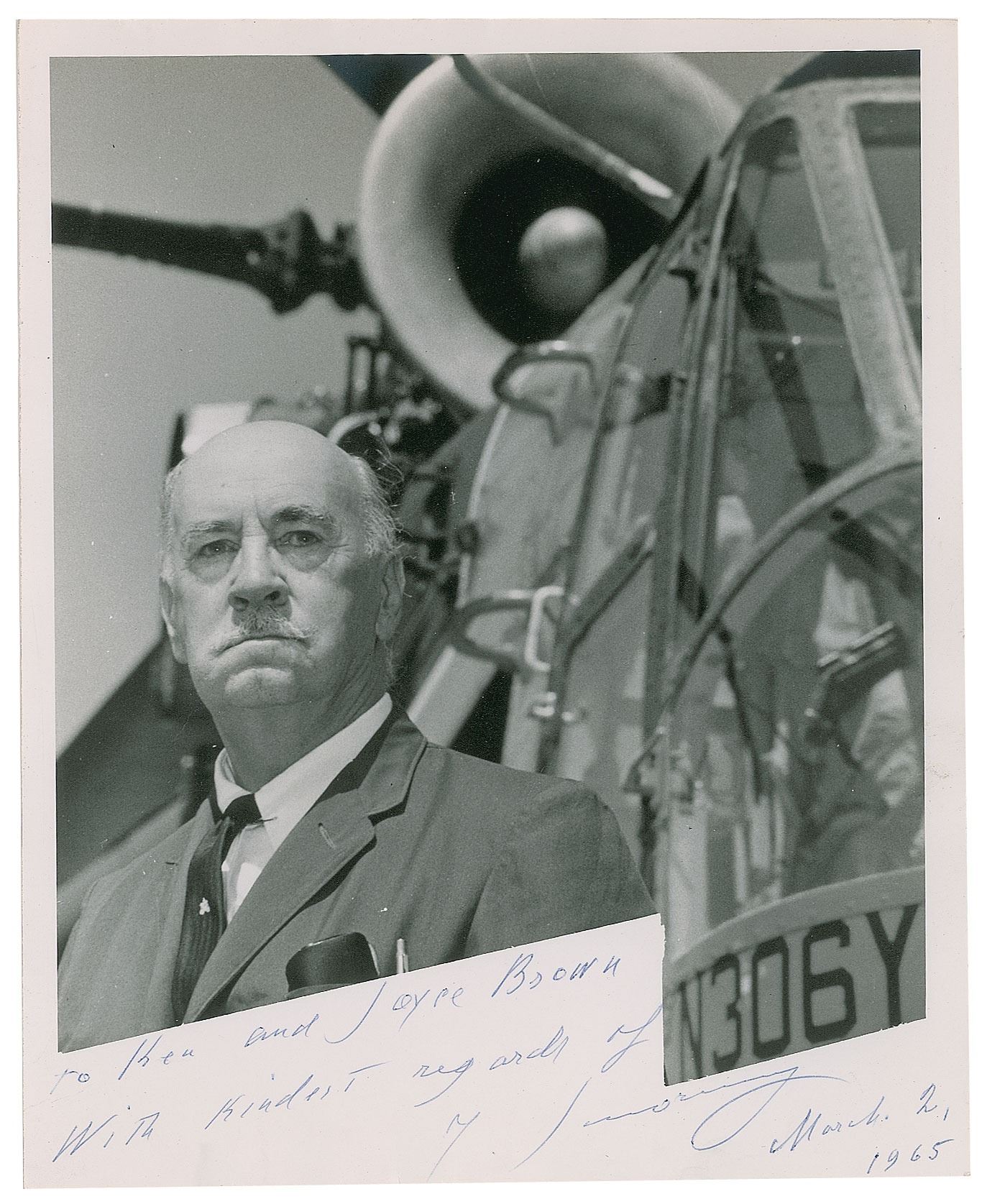 Pioneering aviation engineer (1889-1972) who developed the first four-engine airplane and the first modern helicopter to be put into widespread use. Two items: a TLS, signed "I. Sikorsky," one page, 8.5 x 11, Sikorsky Aircraft letterhead, March 2, 1966, in part: "I have taken two trips through the bottom of Grand Canyon which were tremendously impressive and have also flown across it in a helicopter. In line with your request I am glad to enclose an autographed photograph"; and a vintage matte-finish 8 x 9.75 photo of Sikorsky posing next to a helicopter, signed and inscribed in the lower border in blue ballpoint, "To Ken and Joyce Brown, With kindest regards of I. Sikorsky, March 2, 1965." In overall very good to fine condition, with edge rippling to the photo, and paperclip impressions to the top edge of both.