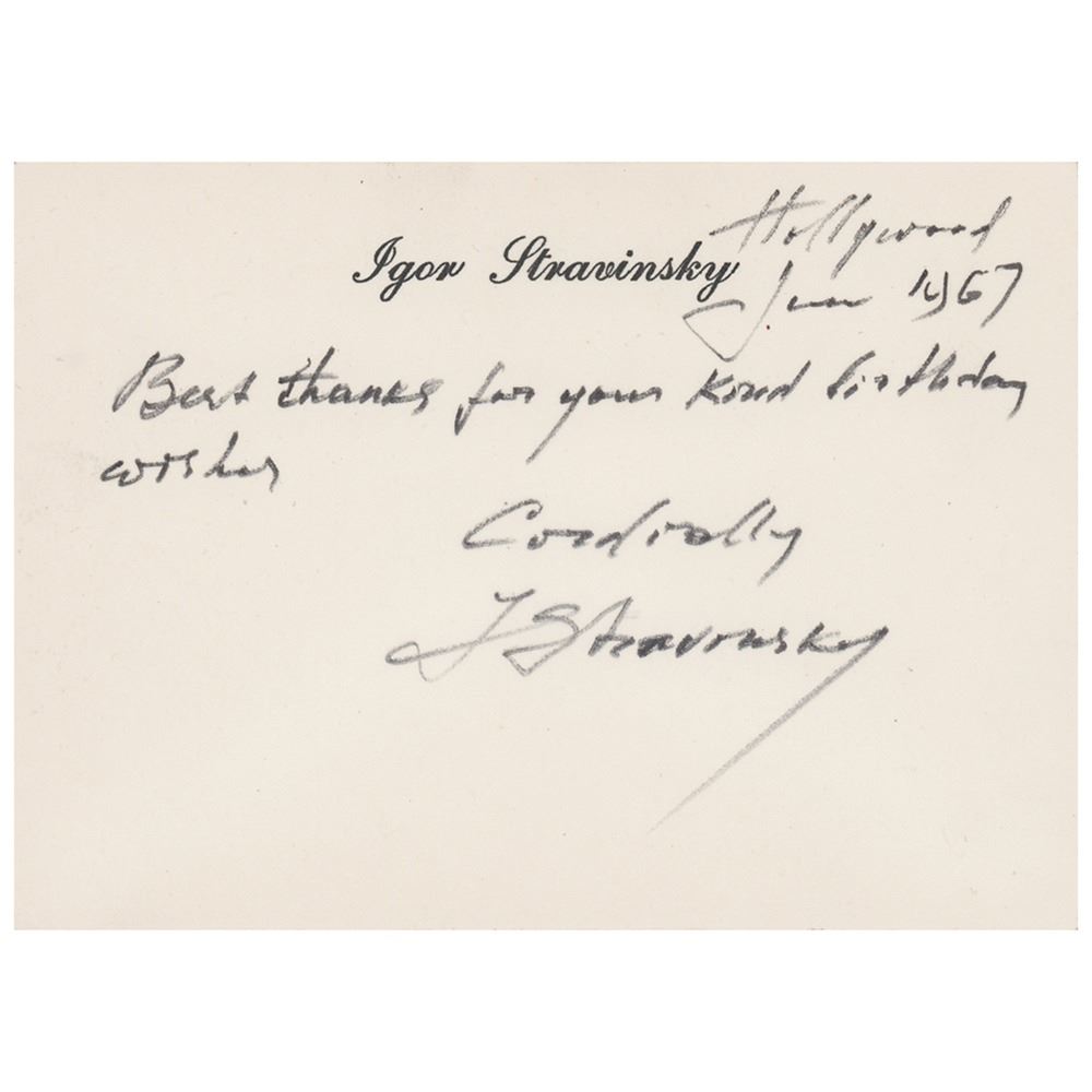 Desirable felt tip signature, "Hollywood, June 1967, Best thanks for your kind birthday wishes, Cordially, I. Stravinsky,†on an off-white 5 x 3.75 personal stationery card. In very fine condition.