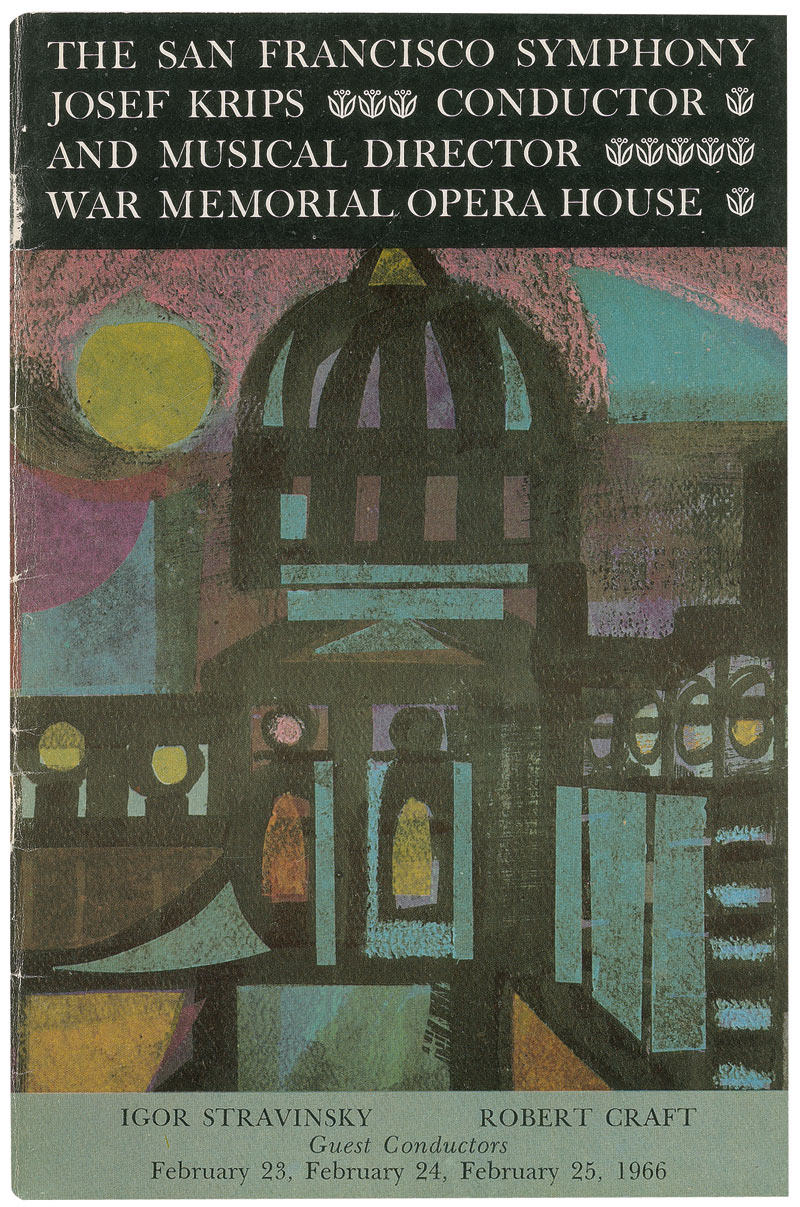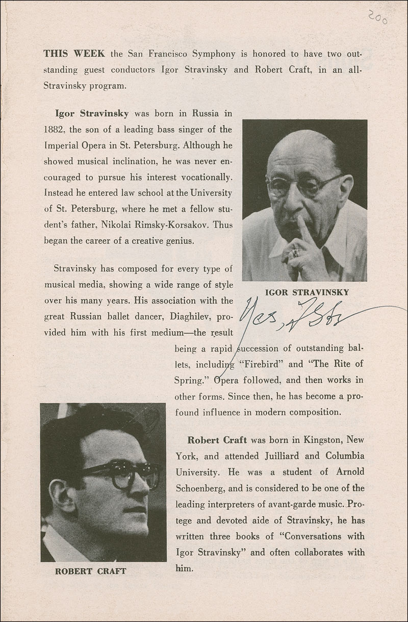 Program, 5.75 x 8.75, for the San Francisco Symphony’s February 1966 performance in which Stravinsky was a guest conductor, Signed inside in black ink by Stravinsky under his image. In fine condition, with light overall handling wear, and paper loss to second page.