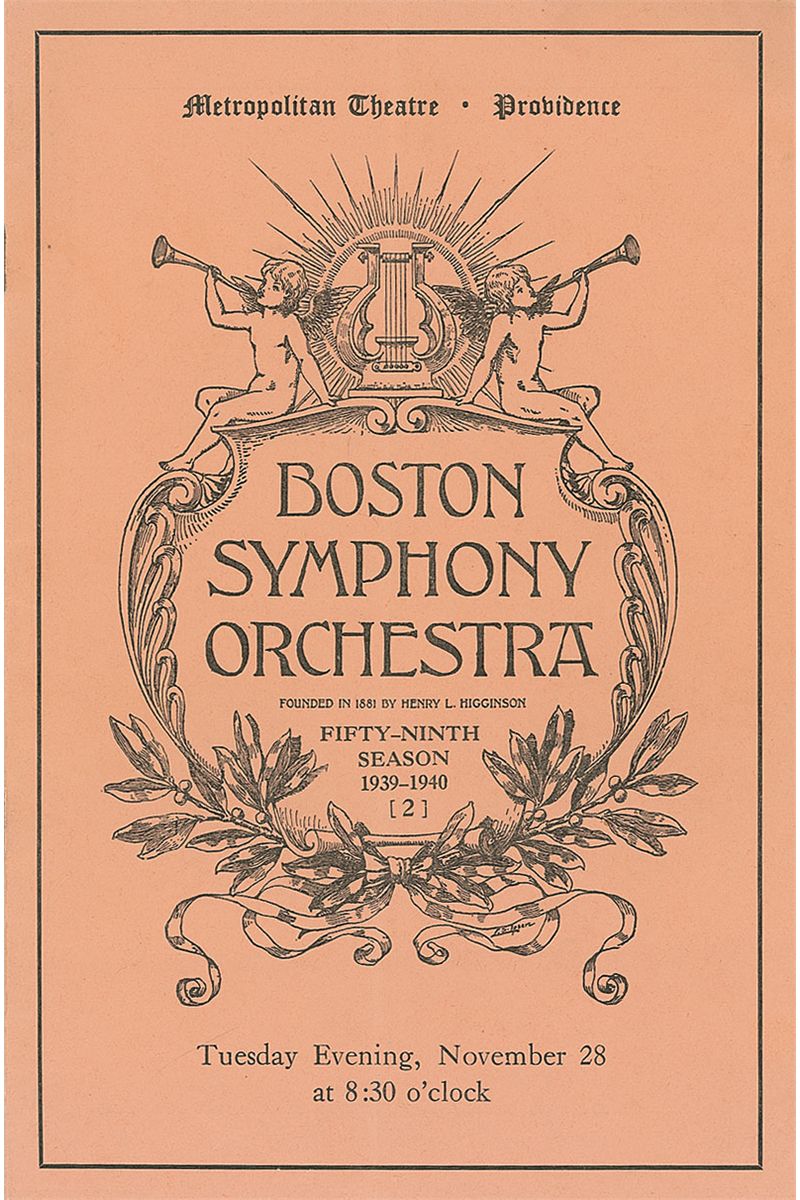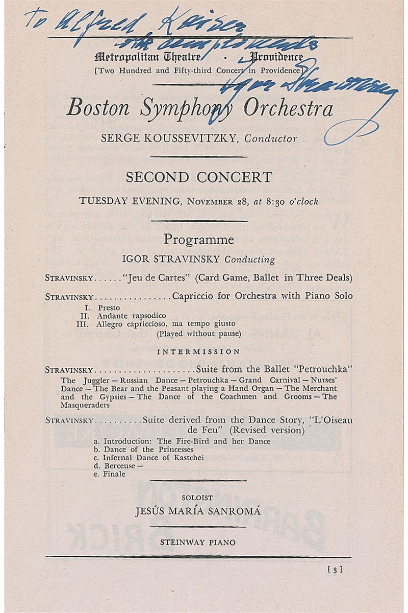 Program from Stravinsky’s performance with the Boston Symphony Orchestra at the Metropolitan Theatre in Providence, on November 28, 1939, 5.5 x 8.5, 20 pages, signed and inscribed on the third page in fountain pen. In fine condition, with a light central vertical fold and mild handling wear.
