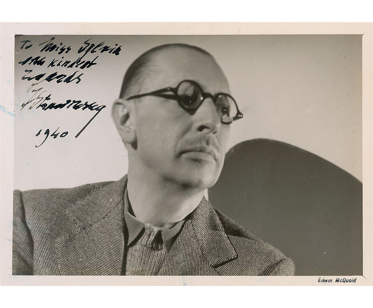 Vintage matte-finish 7 x 5 photo, signed and inscribed in fountain pen “To Miss Sylvia, with kindest regards, I Stravinsky 1940.” Rippling to horizontal edges, a crease to top right corner, and some stray marks to left edge, otherwise fine condition.