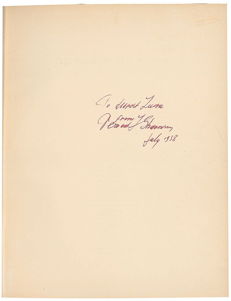 Signed book: The Face of the World. First edition. NY: John Day Company. Hardcover with dust jacket, 9 x 11, 250 pages. Signed and inscribed on the first free end page, “To dearest Leon from Vera & I Stravinsky, July 1958.” Autographic condition is fine with a bit of scattered light toning. Book condition: VG/VG-. Blue and black cloth-covered boards; light wear to edges (mostly at corners and spine-ends); slightly shelf-cocked (binding still strong); textblock edges slightly yellowed. Dust jacket has chips/tears and creases along edges and folds; two horizontal tears across spine and two slightly larger tears along spine-edges; moderately soiled and yellowed, darkest along spine.