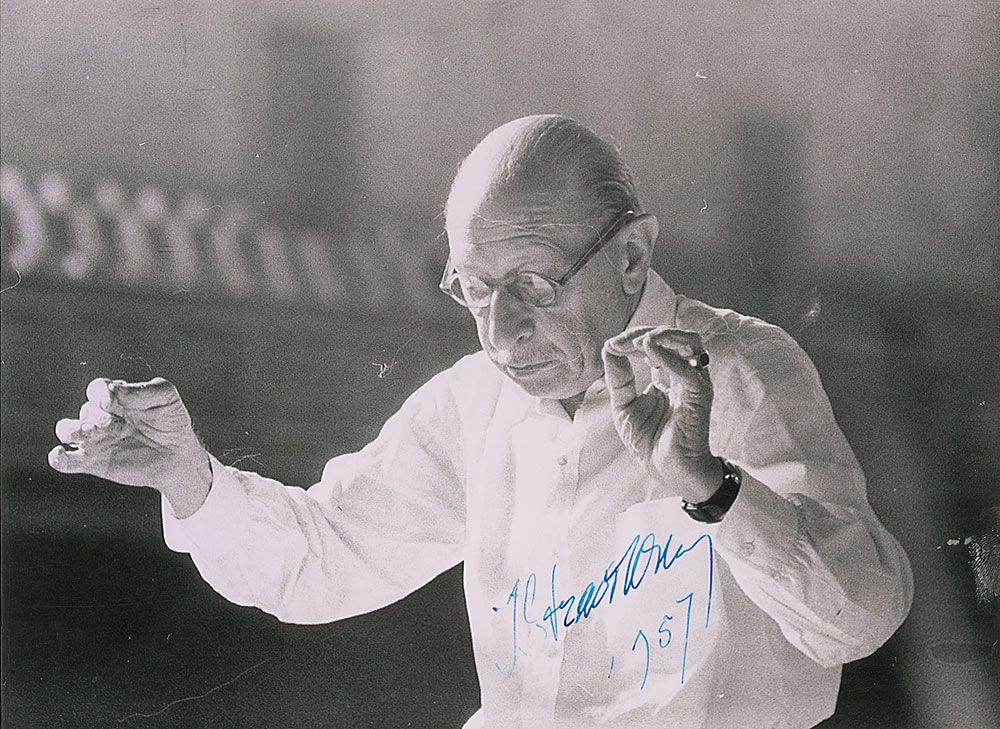Vintage glossy 9.5 x 7 photo of Stravinsky conducting, signed in fountain pen “I. Stravinsky, 1957.” In very good to fine condition, with minor surface marks, dings, and scattered flaws inherent to negative, light rippling, and slightly irregular ink adhesion to first two letters of signature.