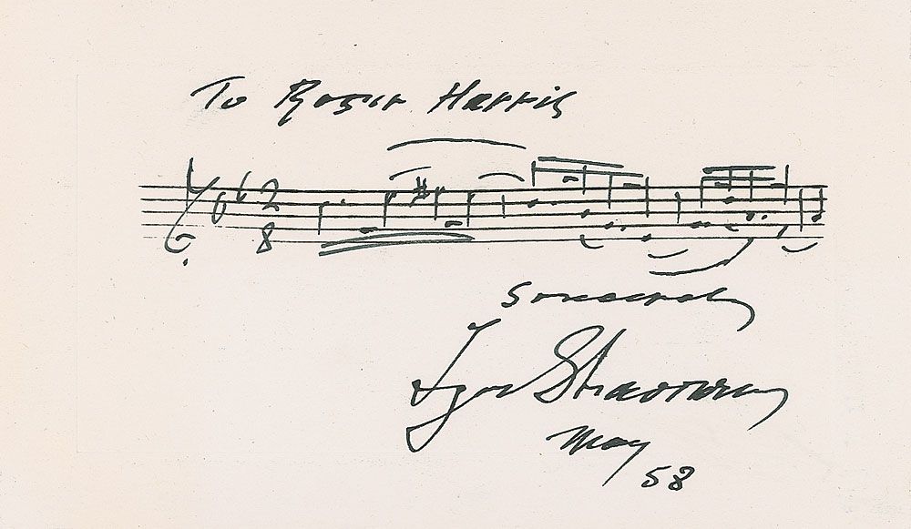 Beautiful AMQS on white double-weight 5.75 x 3.5 custom-made collector’s card, similar in look to an invitation card. Stravinsky pens several bars of music from Apollo, signing and inscribing, “To Roger Harris, Sincerely, Igor Stravinsky, May 58.” In very fine condition. Used famously by George Balanchine for his ballet of the same name, Apollo opened to rave reviews in 1928, and continues to be performed around the world to this day.