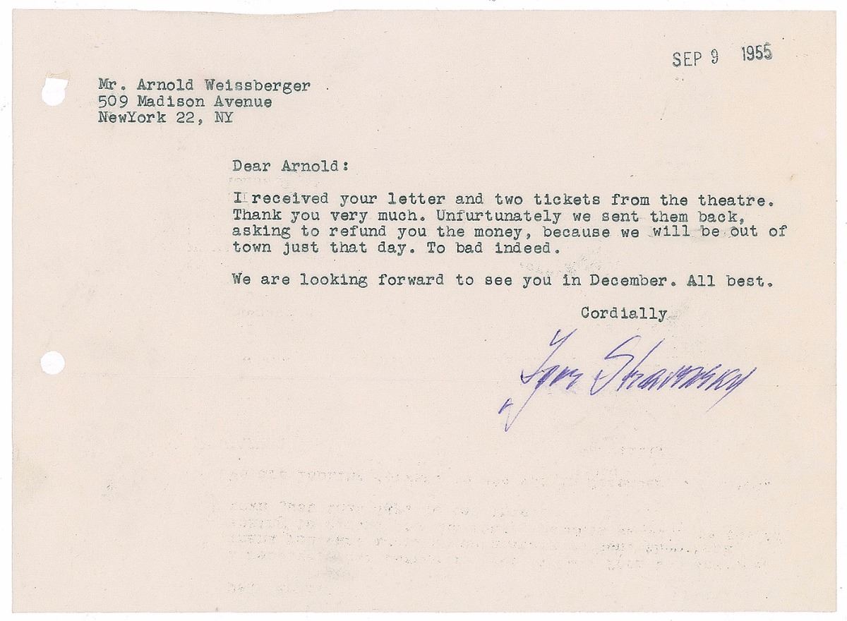 TLS, one onionskin page, 8.5 x 6.25, stamp-dated September 9, 1955. Letter to Arnold Weissberger, in full: “I received your letter and two tickets from the theatre. Thank you very much. Unfortunately we sent them back, asking to refund you the money, because we will be out of town just that day. To[o] bad indeed. We are looking forward to see you in December. All best.” In fine condition.