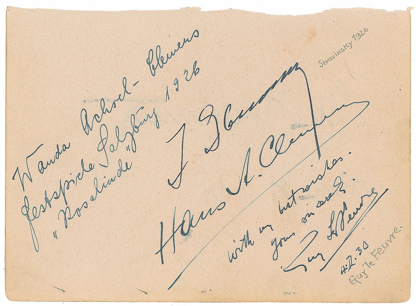 Vintage fountain pen signature, "I. Stravinsky,” on an off-white 6.75 x 5 album page bearing a few other signatures, including that of actor Guy Le Feuvre. In fine condition, with scattered soiling.