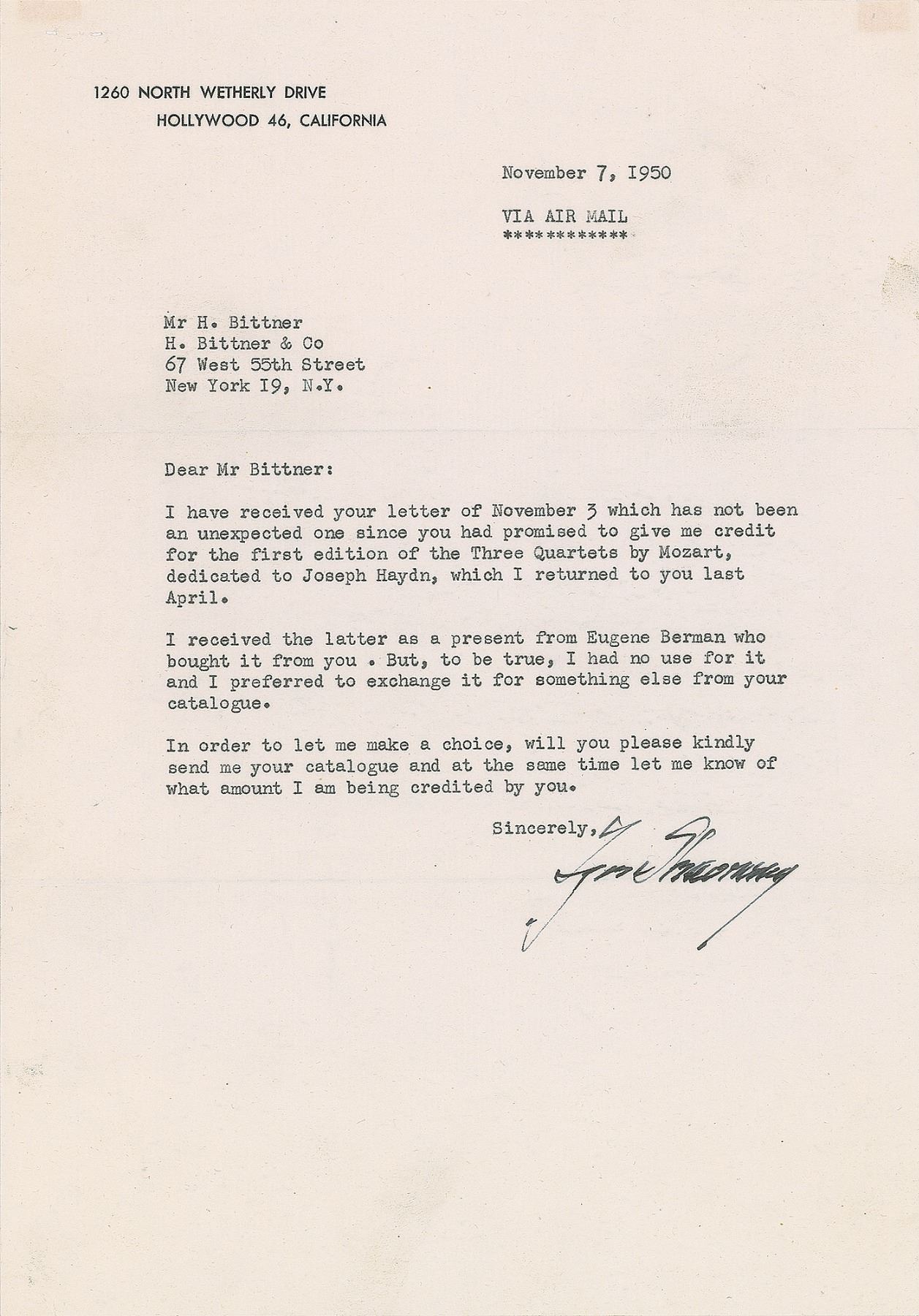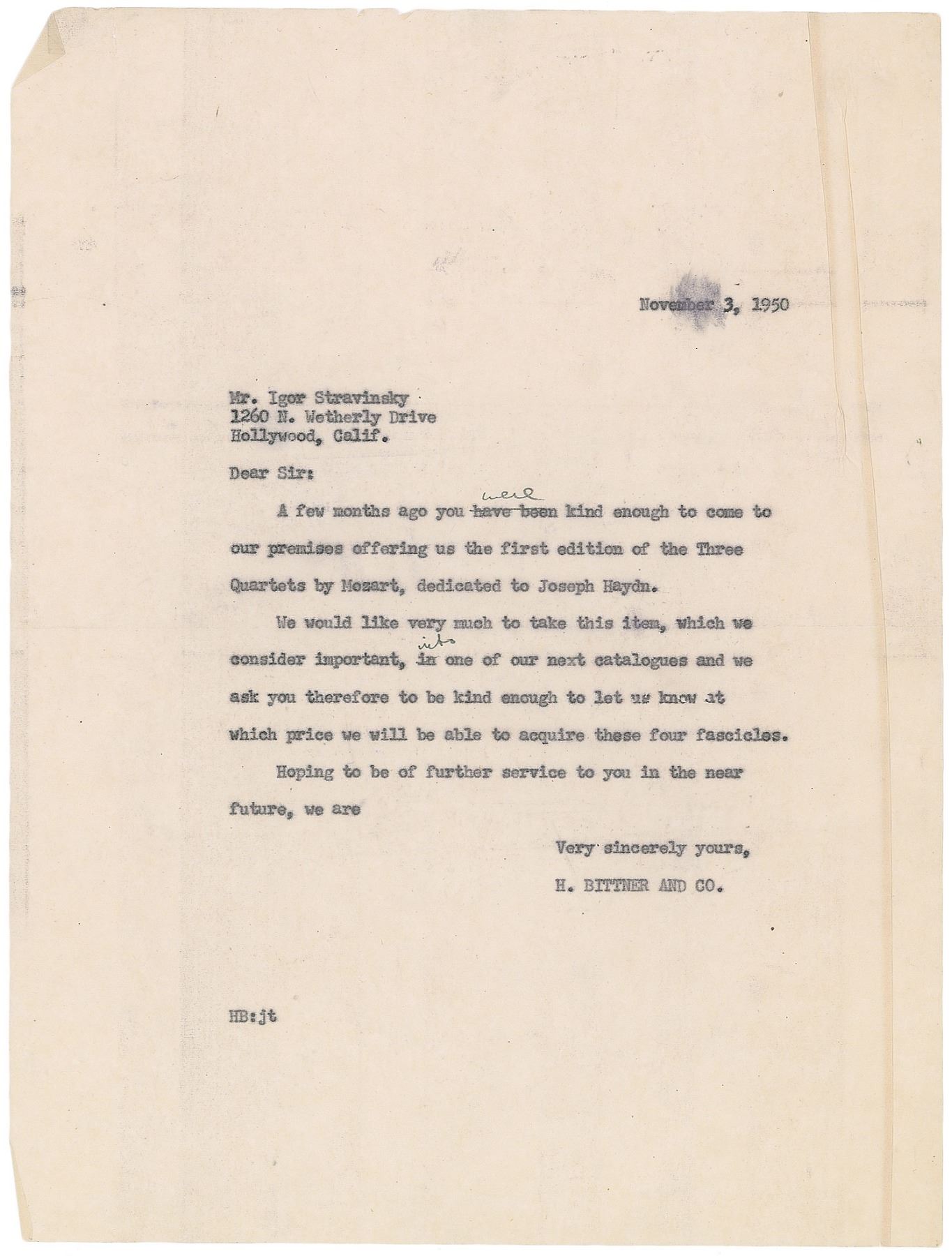 TLS, one page, 7.25 x 10.5, personal letterhead, November 7, 1950. Letter to Mr. H. Bittner of New York, in part: "I have received your letter of November 3 which has not been an unexpected one since you had promised to give me credit for the first edition of the Three Quartets by Mozart, dedicated to Joseph Haydn, which I returned to you last April. I received the latter as a present from Eugene Berman who bought it from you. But, to be true, I had no use for it and I preferred to exchange it for something else from your catalogue. In order to let me make a choice, will you please kindly send me your catalogue and at the same time let me know what amount I am being credited by you." In fine condition, with staple holes to the upper left, and light show-through at upper corners from two small pieces of tape on the reverse. Accompanied by Bittner's retained carbon copy of his November 3rd letter to Stravinsky, inquiring about the disposition of the Mozart book.