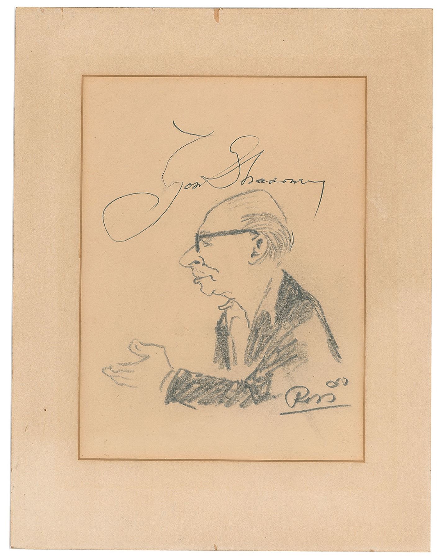 Original vintage pencil sketch of the legendary Russian composer-pianist accomplished by "Ross" on an off-white 6.25 x 8.5 sheet, prominently signed across the top in ink, "Igor Stravinsky." Matted to an overall size of 9.25 x 12. In fine condition.