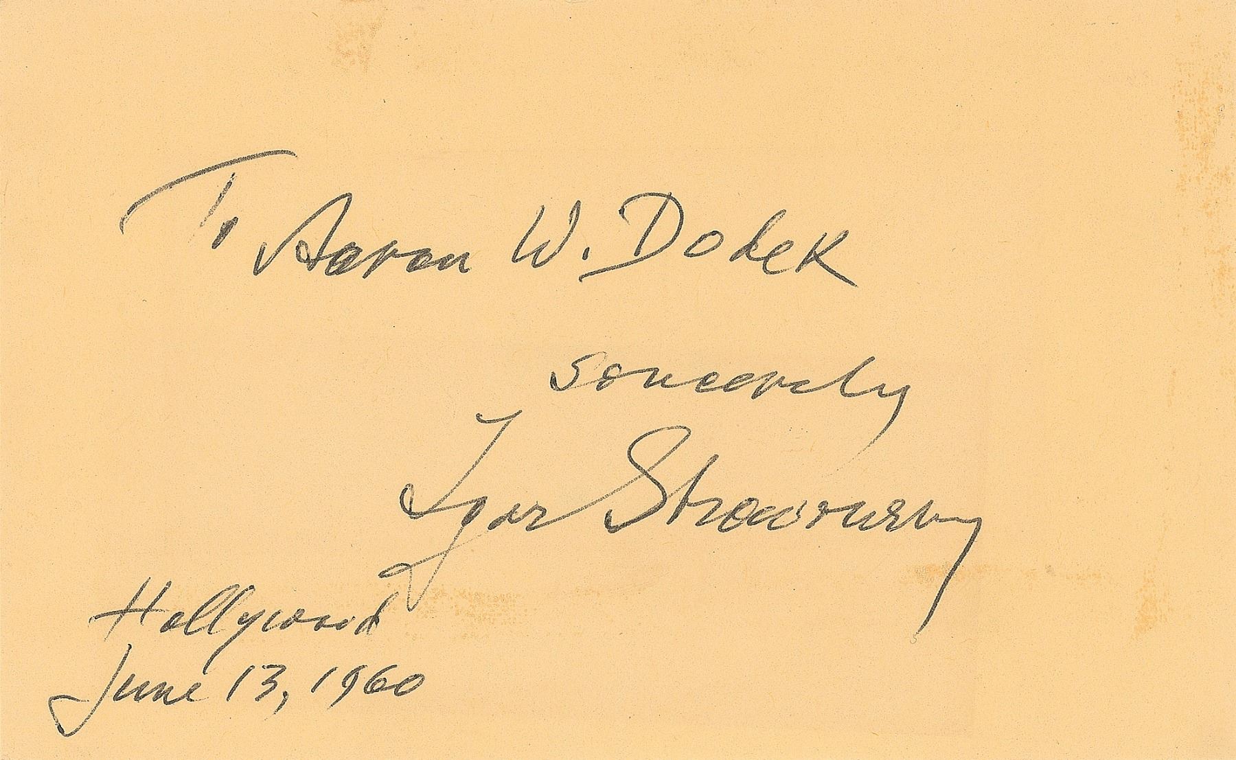 Ballpoint signature and inscription, "To Aaron W. Dodek, sincerely, Igor Stravinsky, Hollywood, June 13, 1960,” on an off-white 5 x 3 card. In fine condition, with some light soiling.