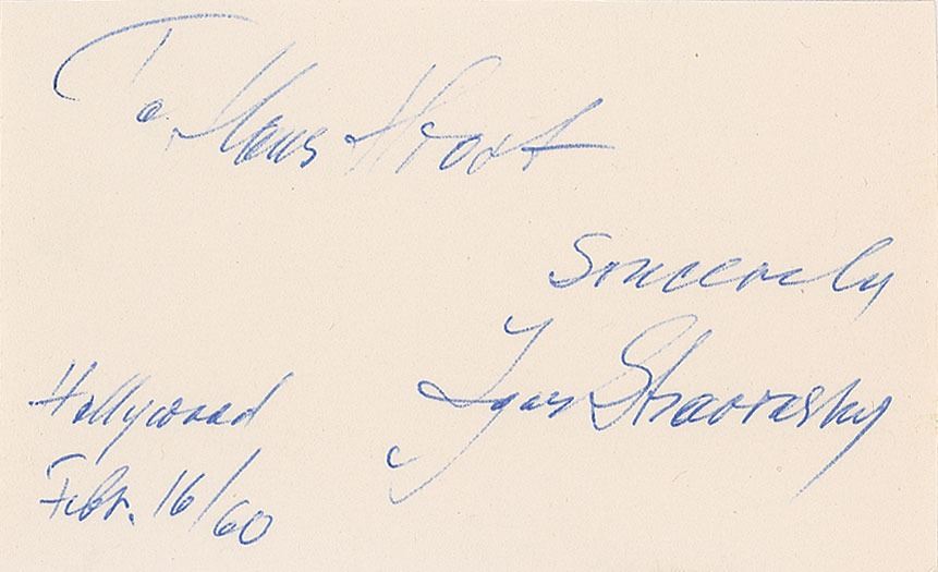 Ballpoint signature and inscription, "To Hans Stroot, Sincerely, Igor Stravinsky, Hollywood, Febr. 16/60,” on an off-white 3.5 x 2 card. In very fine condition.