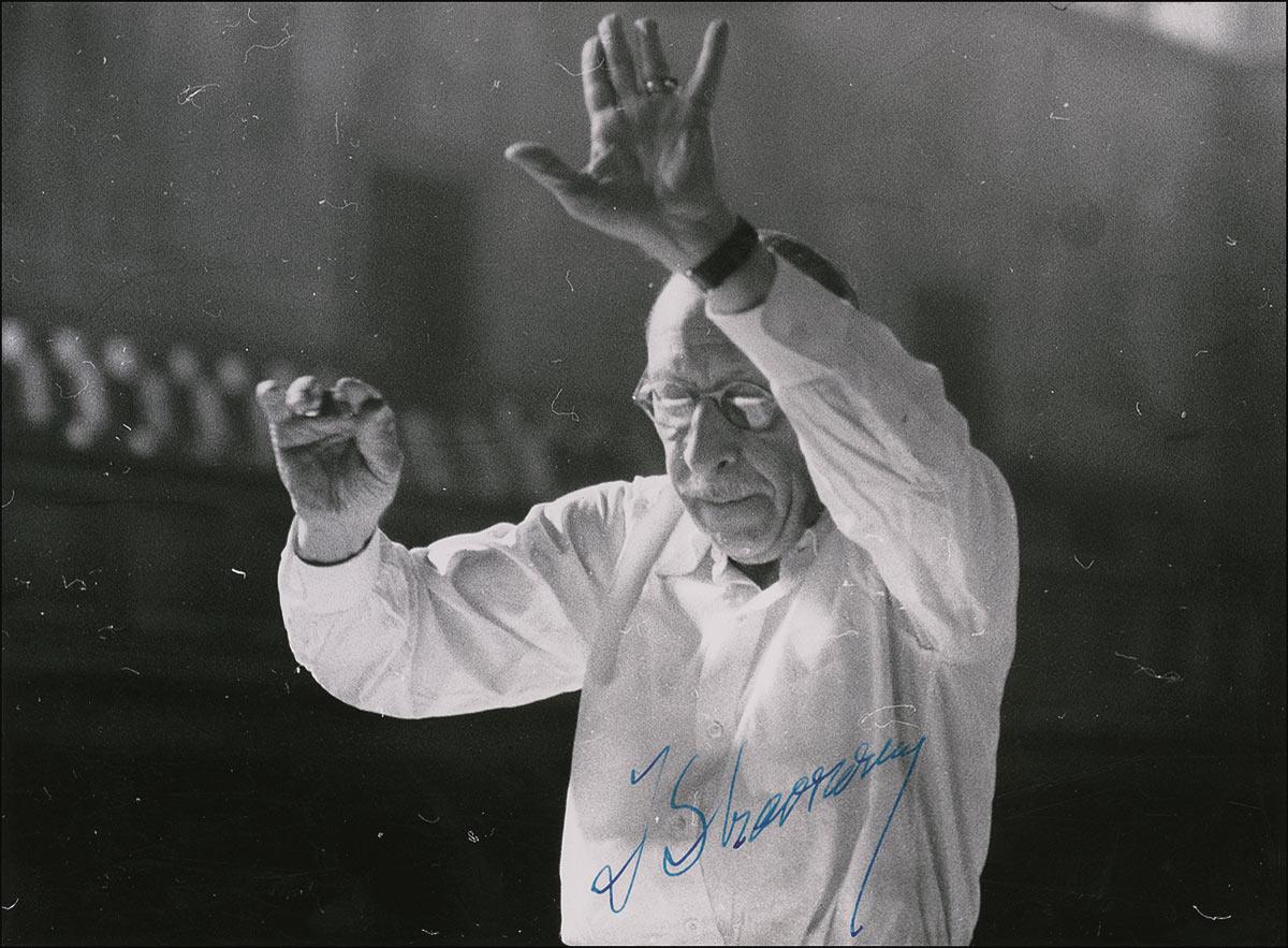 Russian-born composer (1882–1971) whose distinctive, colorful, constantly evolving style earned him a place among the most influential composers in music history. His ballets The Firebird, Petrouchka, and Rite of Spring represent three central benchmarks of 20th-century music. Vintage glossy 9.5 x 7 photo of Stravinsky conducting emphatically, signed in blue ink. A few minor surface marks and scattered flaws inherent to negative, otherwise fine condition. Pre-certified PSA/DNA and RRAuction COA.