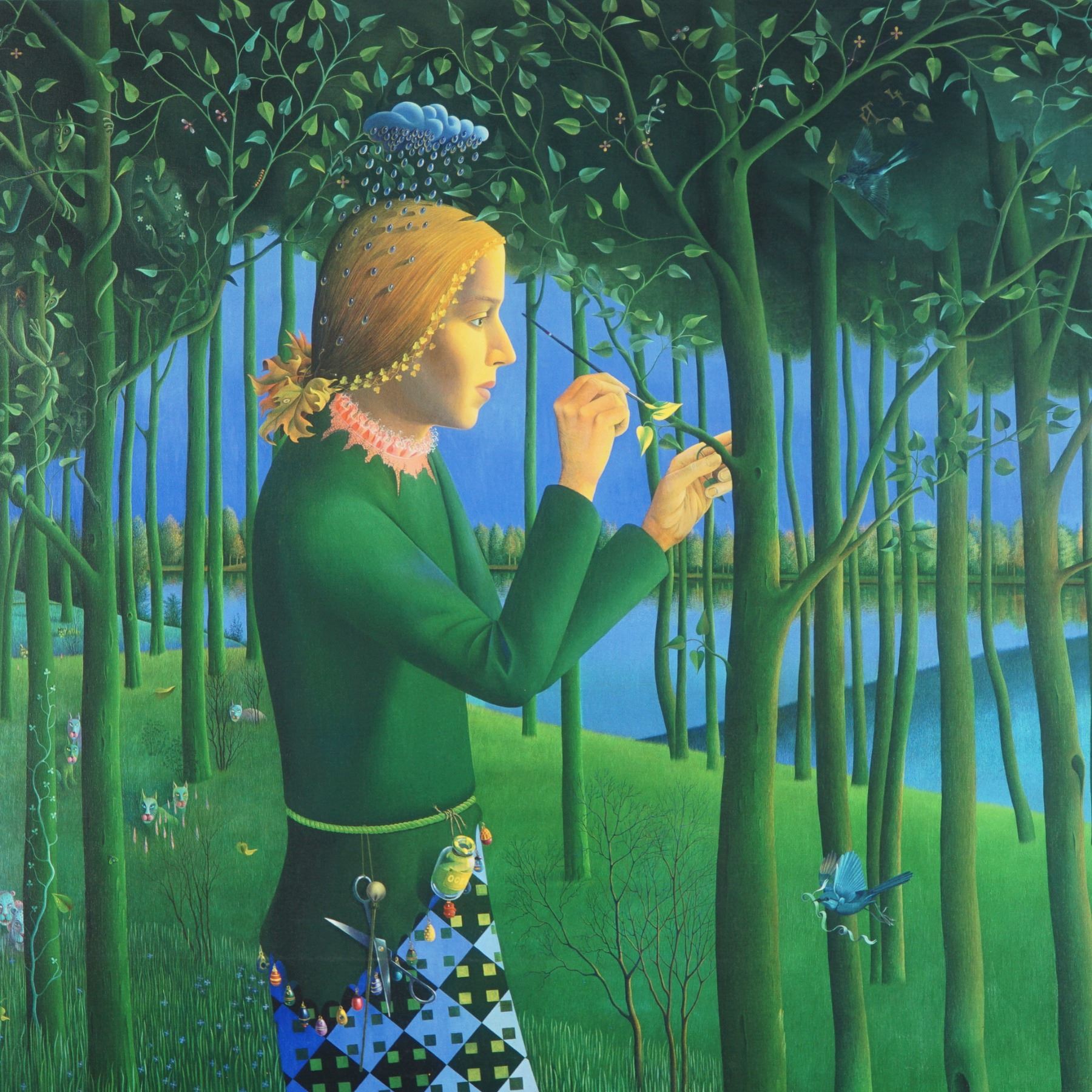 This giclee on canvas titled Autumn is a richly imaginative and symbolic work by Russian-American artist Igor Tulipanov. The composition features a solitary female figure in a stylized forest, delicately tending to a budding tree branch. Her patterned skirt, whimsical accessories, and the fauna surrounding her, including cats, rabbits, and surreal elements like floating jars, invite viewers into a dreamlike woodland narrative. The work is vibrantly detailed and suffused with surrealist charm. Igor Tulipanov is a Russian-American painter celebrated for his fantastical and allegorical compositions. After emigrating to the United States in the 1970s, Tulipanov gained international recognition for his precise technique and visually complex imagery that blends classical European painting styles with surreal narratives. His works have been exhibited in numerous galleries and are included in esteemed collections worldwide. On lower edge, written in Cyrillic, The Moon with the new frosting golden ray illuminates the surface of the earth, 84 NY. The piece is hand-inscribed A.P. from 15 L.E., indicating it is an Artist Proof from a limited edition of 15 labeled prints. Signed Tulipanov on the lower center.