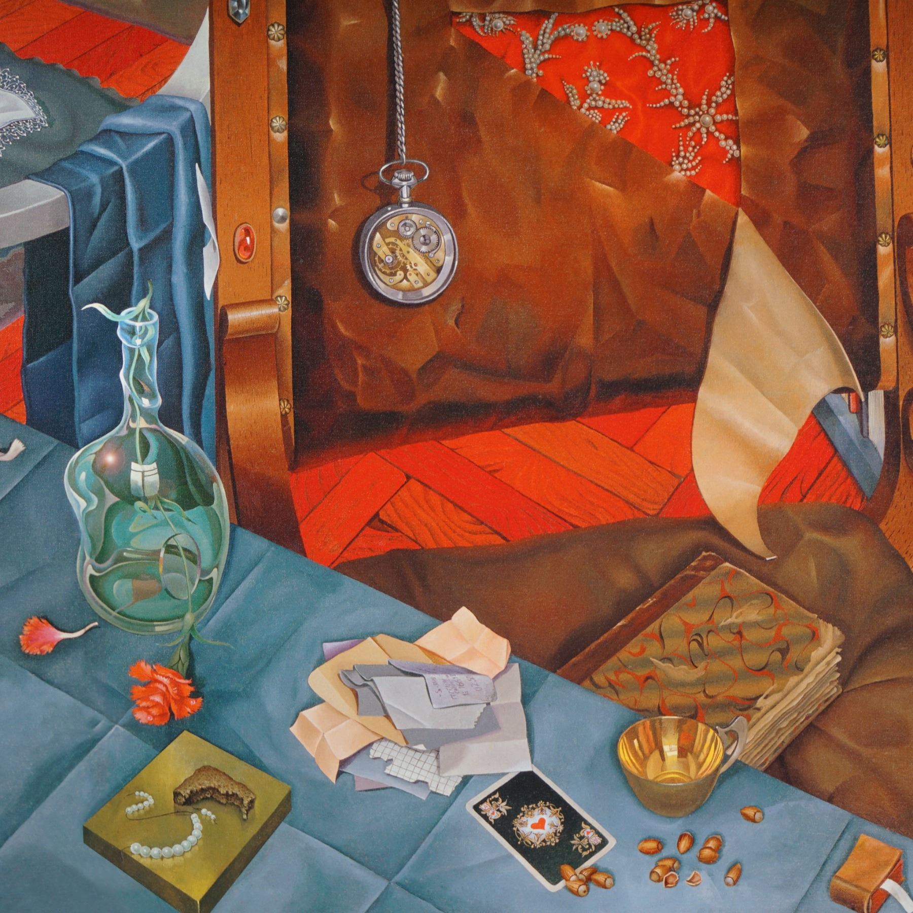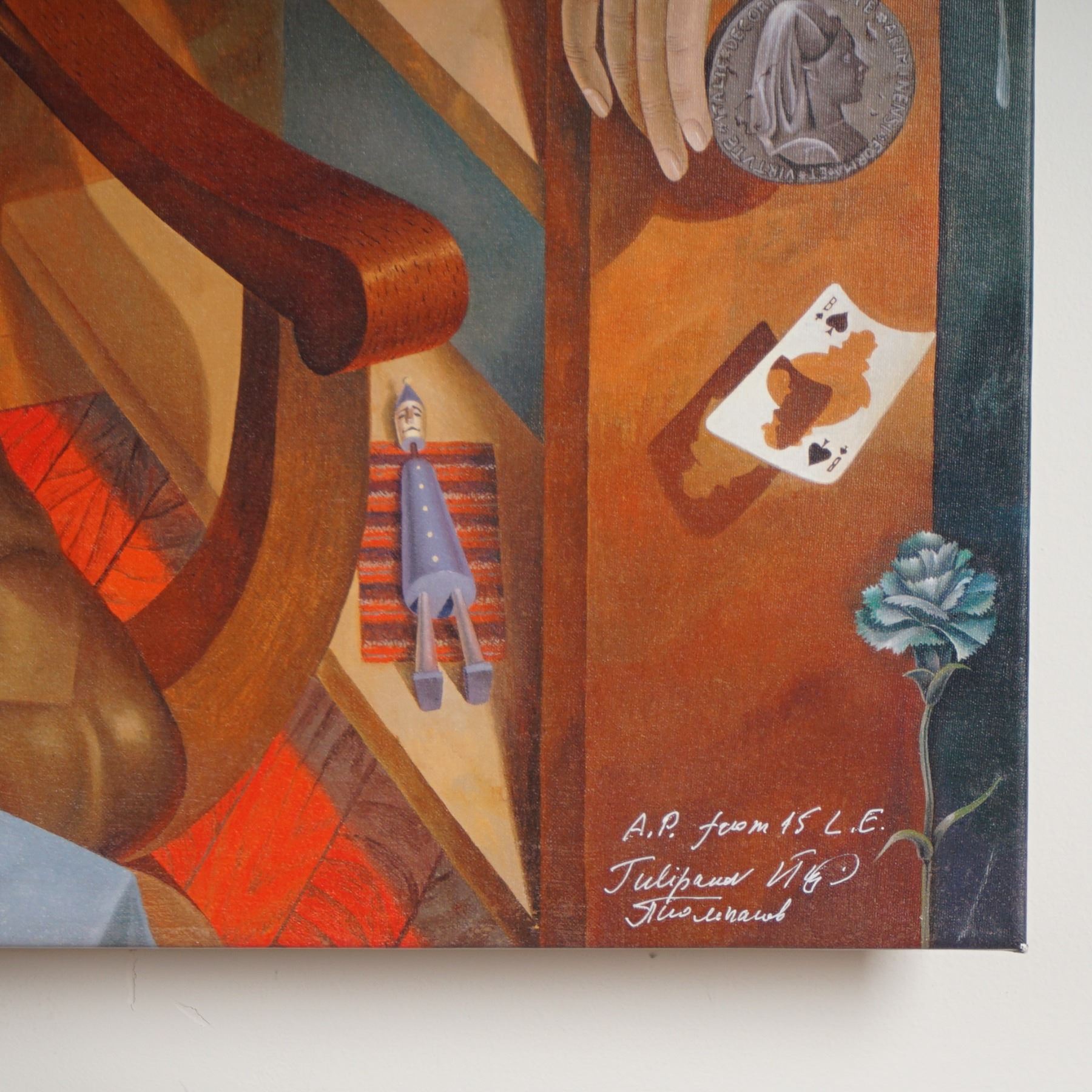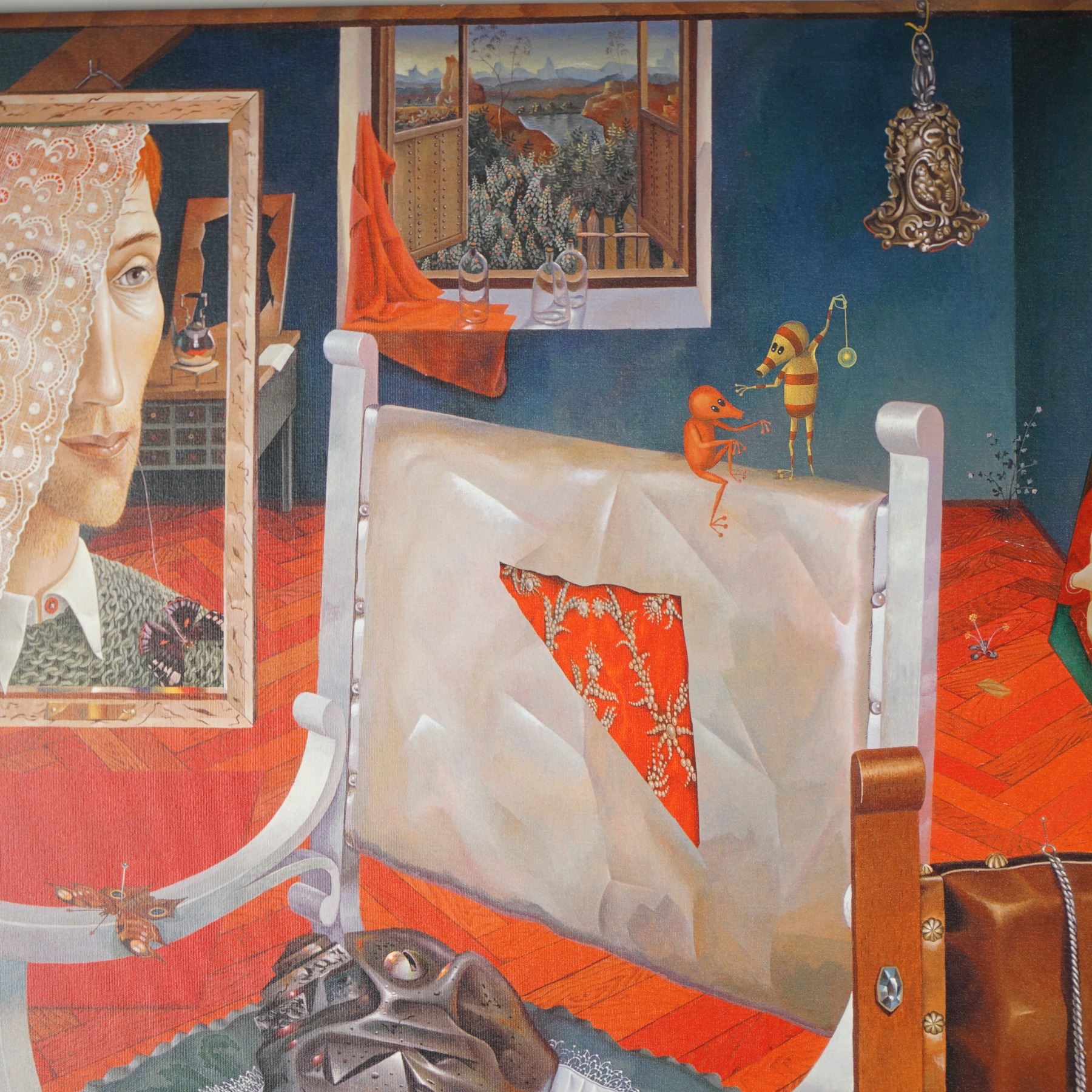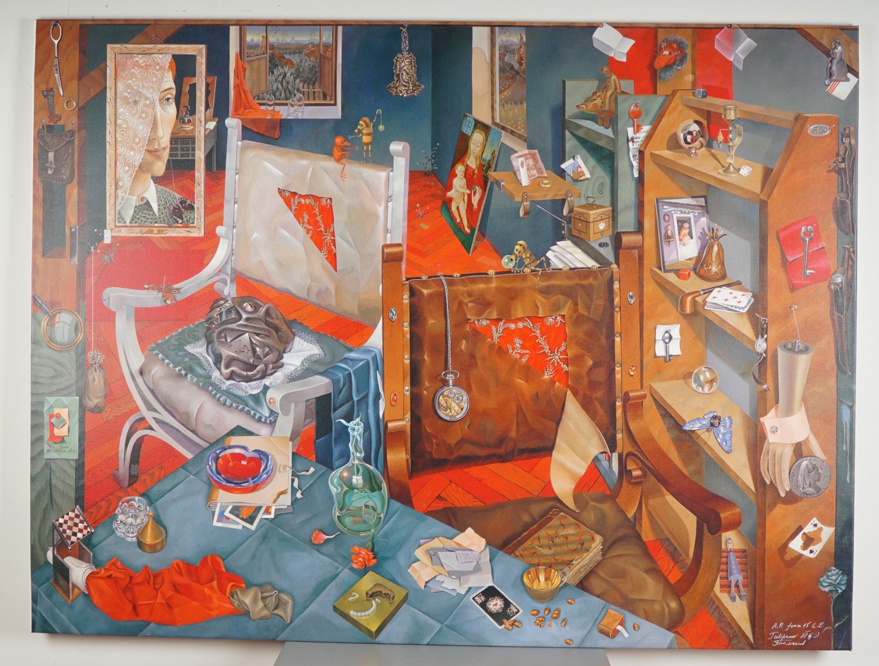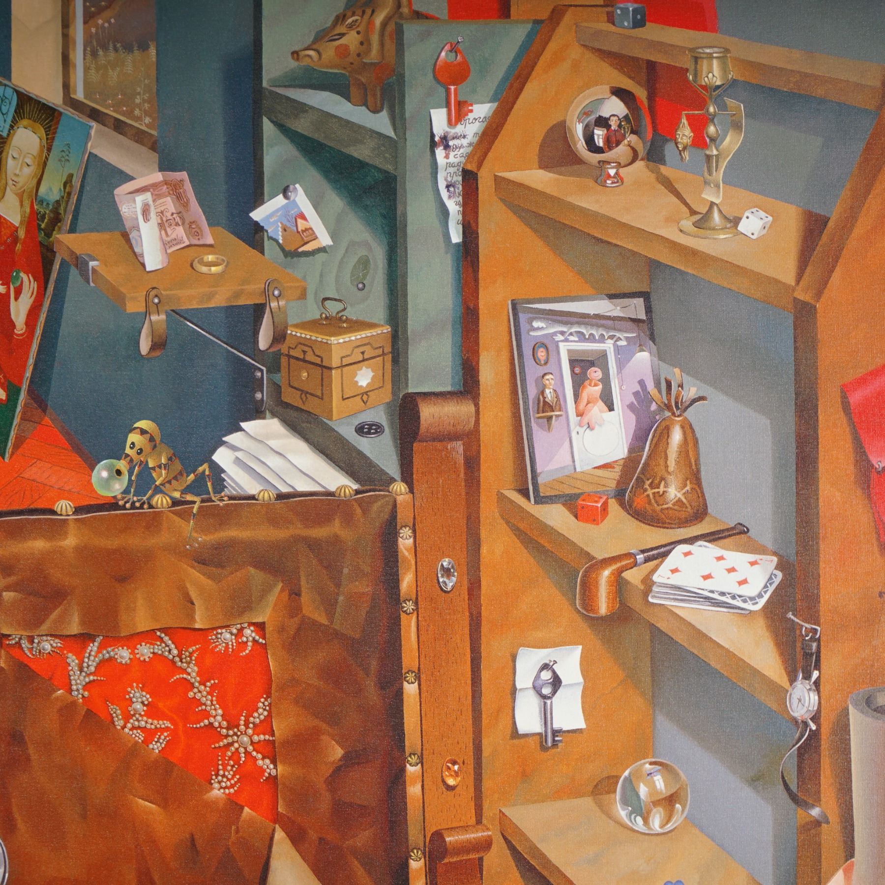 Surreal and symbol-rich composition by Russian-American artist Igor Tulipanov, executed as a giclee on canvas. This intricate scene presents a theatrical interior, densely packed with visual metaphors, classical references, and surreal juxtapositions. Rendered with hyper-realistic precision, the artwork displays a staged setting with chairs, portraits, miniature figures, and objects such as antique keys, clocks, playing cards, and a variety of textured fabrics. Each element contributes to a narrative that blends fantasy and psychological depth. Igor Tulipanov is a Russian-American painter known for his intricate surrealist imagery and technical precision. After emigrating from the Soviet Union in 1979, Tulipanov established himself in the United States, gaining recognition for his theatrical compositions and imaginative symbolic narratives. His works are characterized by their fine detail, philosophical subtext, and incorporation of Old Master aesthetics with contemporary surrealism. Lower right bears a painted inscription: A.P. from 15 L.E., Tulipanov. The work is unframed and stretched on wooden bars.