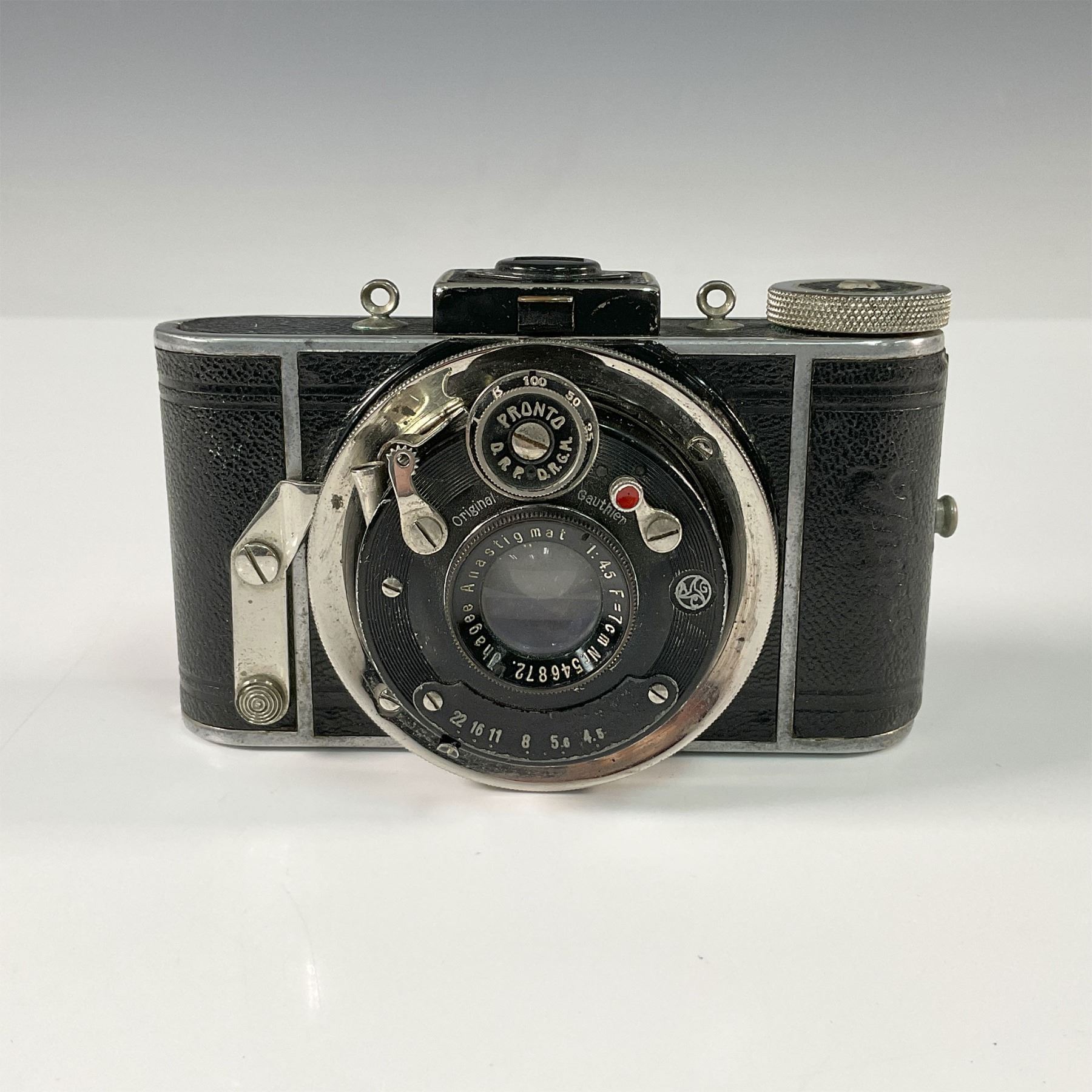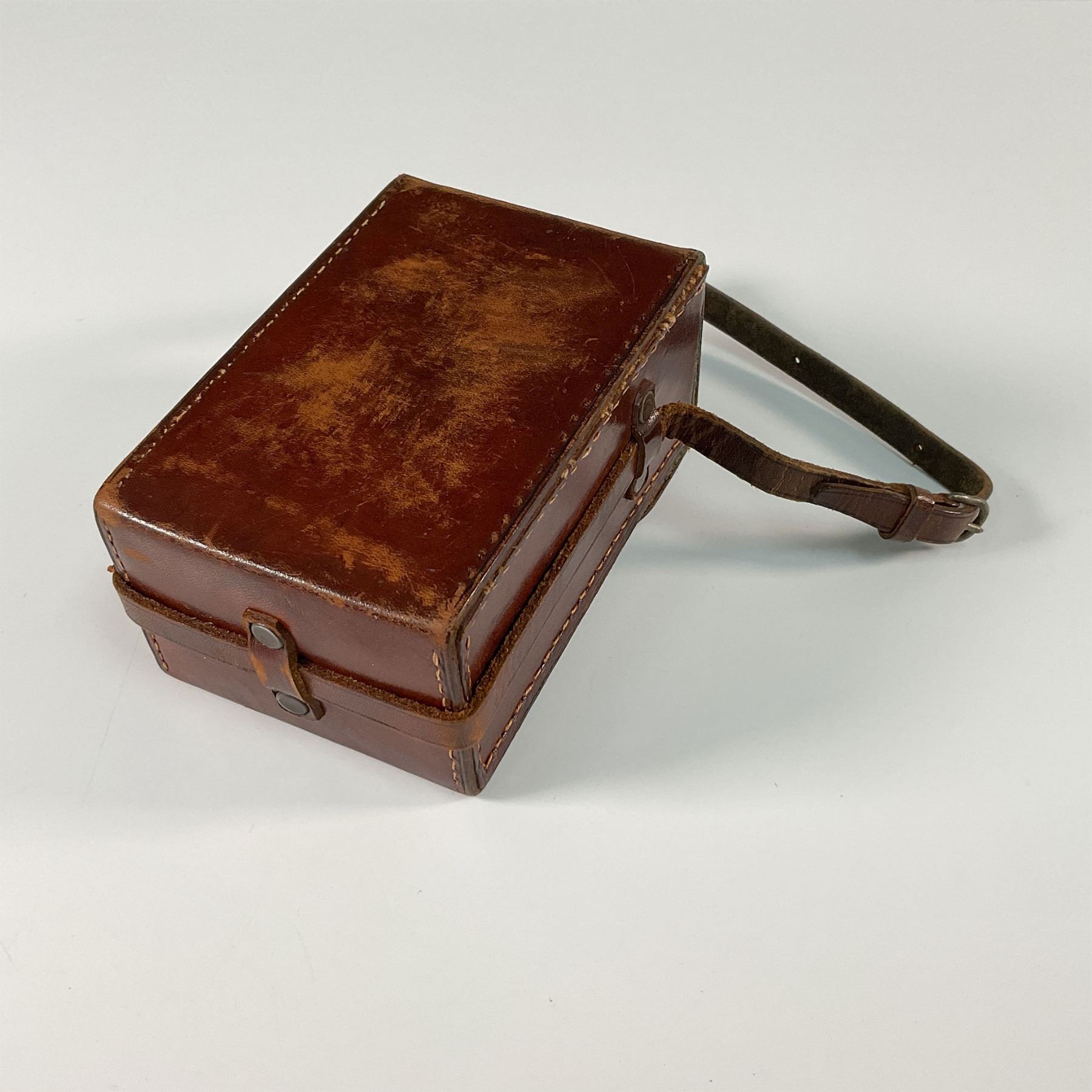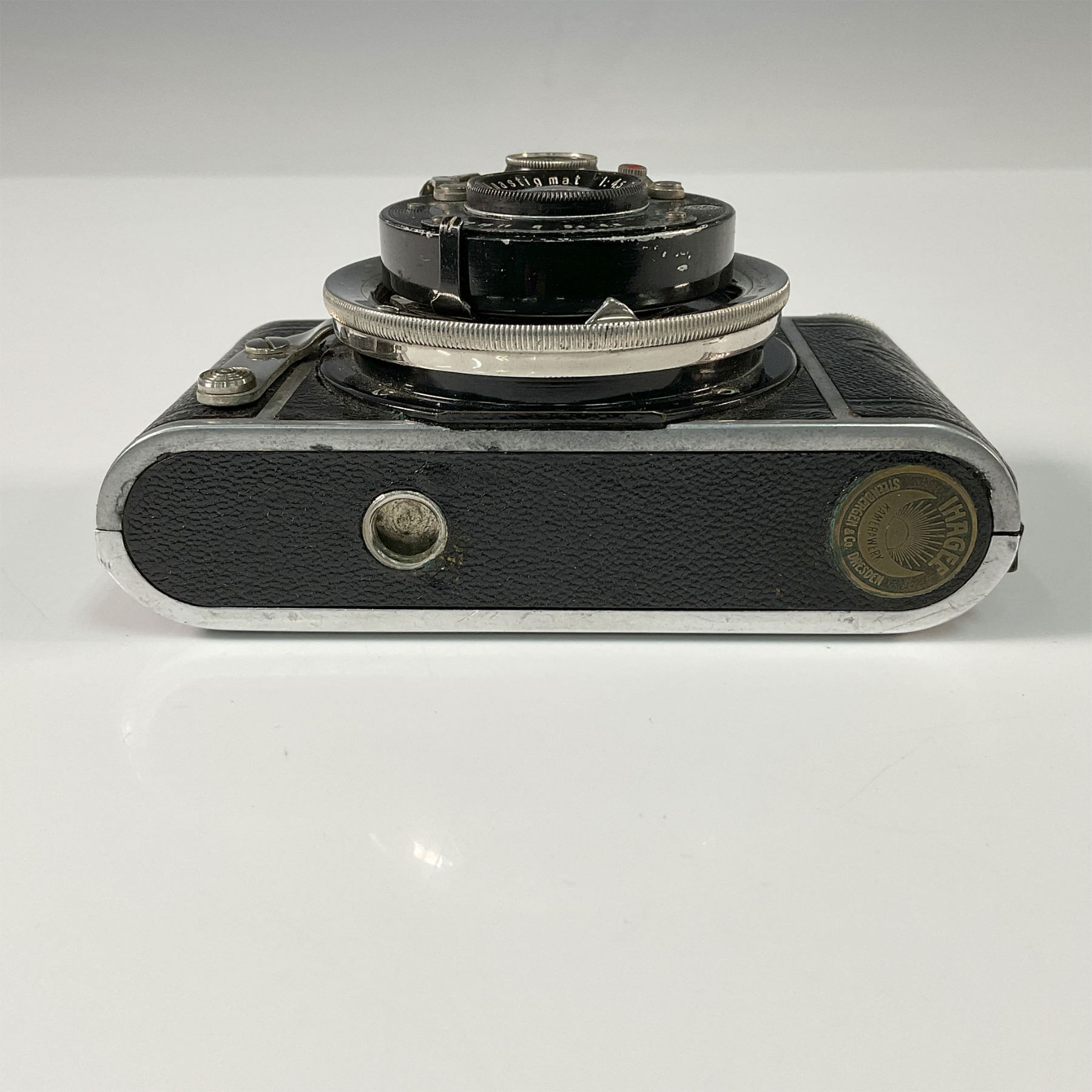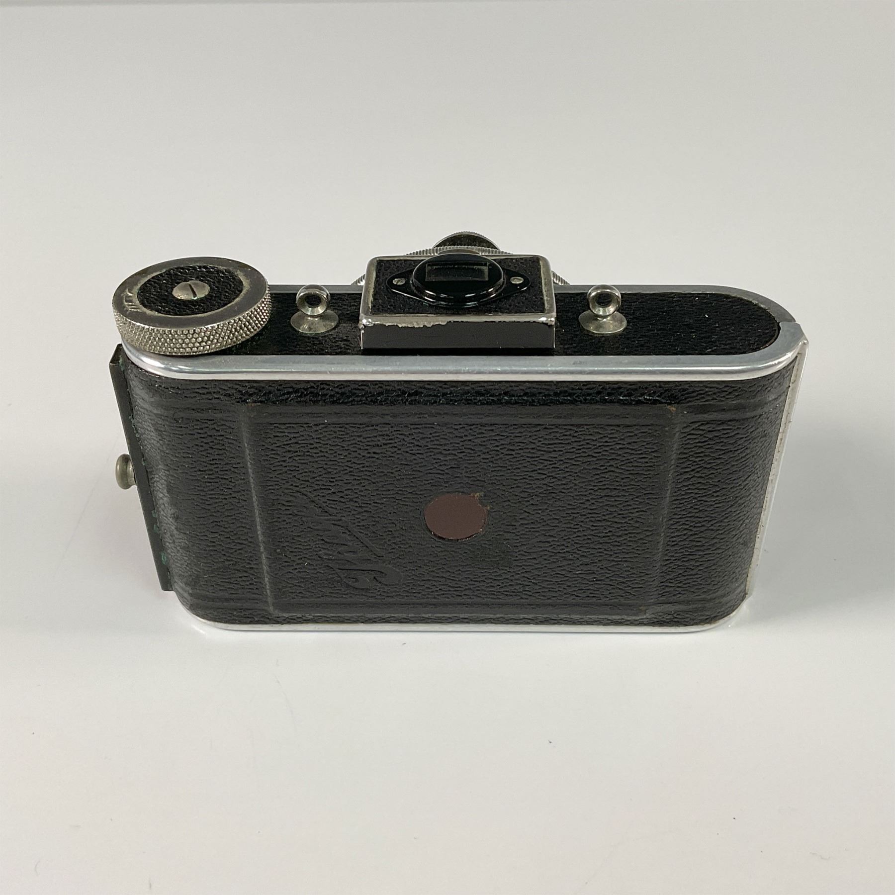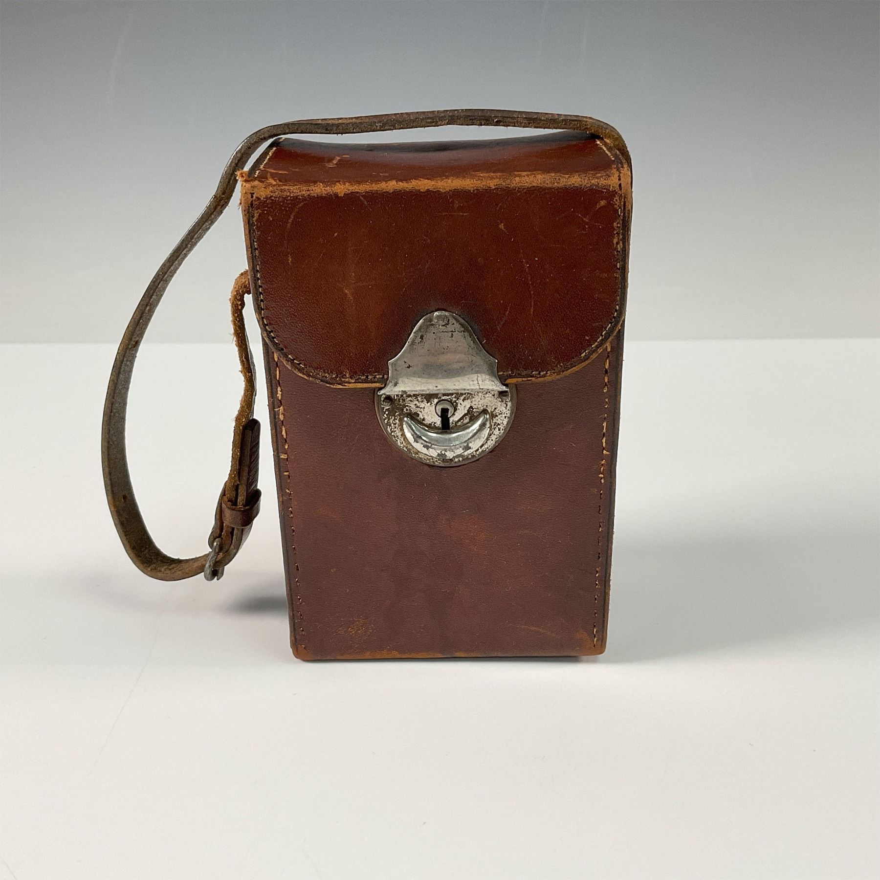 The Ihagee Vest Pocket Camera is a compact, folding camera designed for portability and ease of use. Manufactured by the Ihagee Kamerawerk in Dresden, Germany, this camera showcases precision engineering and elegant design typical of pre-World War II photographic equipment. It features a Prontor shutter and an Anastigmat lens, offering excellent image quality for its time. Includes Anastigmat lens, marked with f/6.3, offering sharp images with excellent detail. Includes brown leather carrying case with strap.