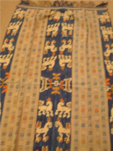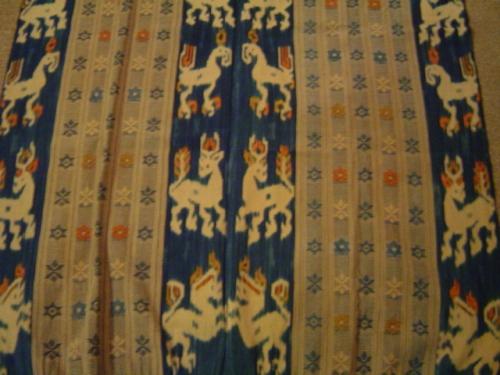 Ikat (e-kat) is the origianl tye-dye. This wonderful fabric is make from beginning to end by the women of Sumba, Indonesia. Using primitive tools, cotton is hand grown, picked, carded and spun into thread. The thread is hand knotted/tyed and then hand dyed using natural dyes from plants, trees, roots and minerals. After the threads are dyed, they are woven together on primitive, back strap looms. The large tapestries are actually two matched tapestries, loomed seperately and hand sewn together. The full tapestry measures 43" X 105", (11" of fringe). These high thread count fabrics have a wonderful feel and durability. The patterns are simply amazing!!!