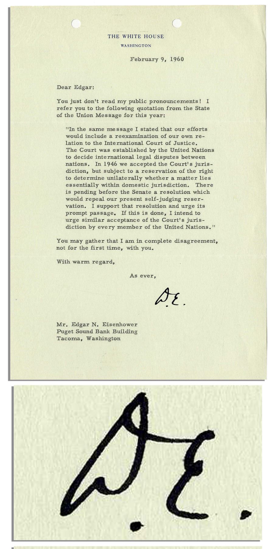 Dwight D. Eisenhower typed letter signed as President, dated 9 February 1960 on official White House stationery. Here, Eisenhower writes to his brother, Edgar, referring to a statement he made in his State of the Union address regarding the International Court of Justice: ''...You just don't read my public pronouncements! I refer to you the following quotation from the State of the Union Message for this year...'' The President then signs off with, ''You may gather than I am in complete disagreement, not for the time time, with you. With warm regard, As ever, [signed] D.E.''. Letter measures 7'' x 10.5'' on one page with two holes punched at top. Near fine.