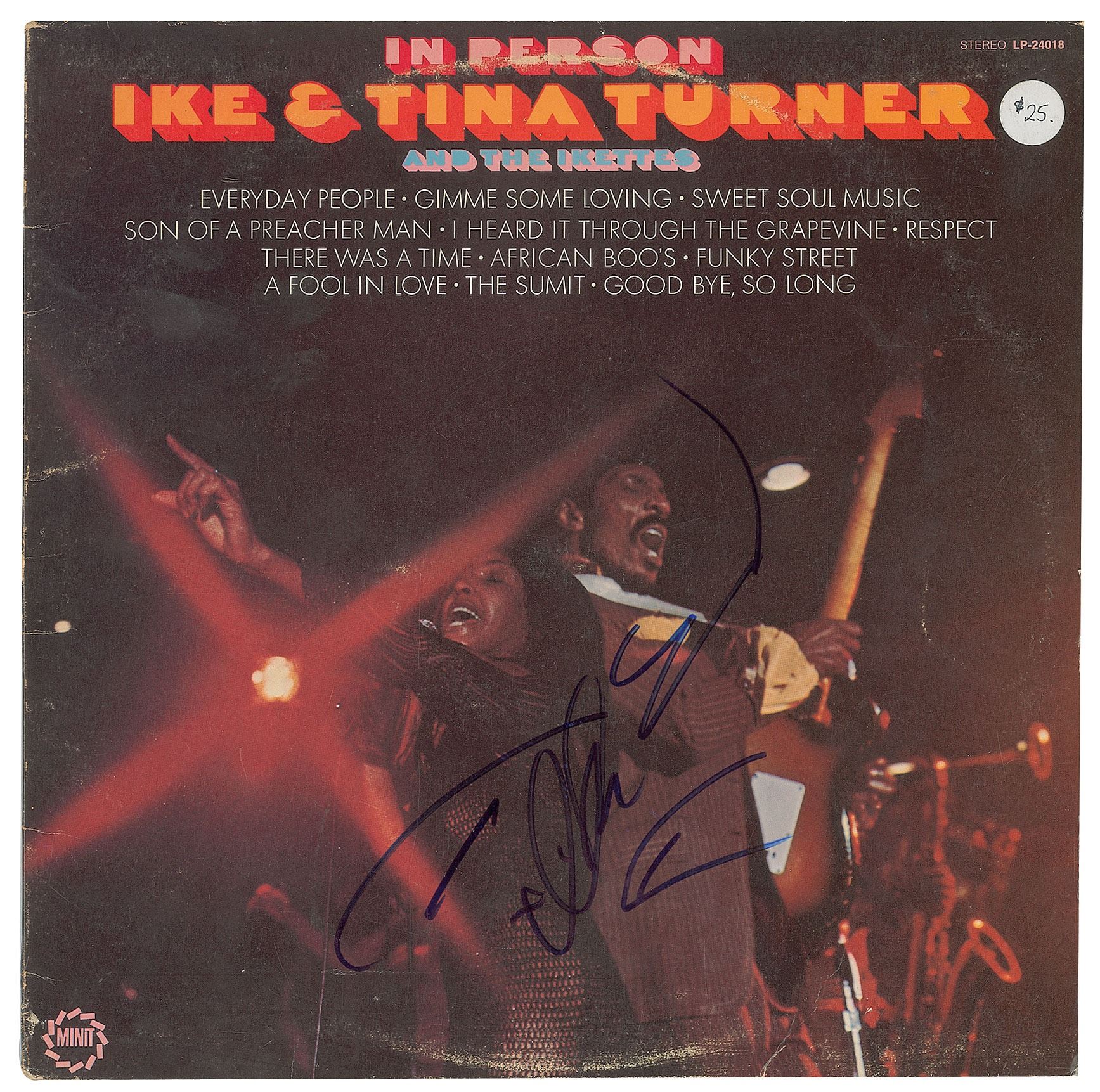 In Person Ike & Tina Turner and the Ikettes album signed on the front cover in blue felt tip by Ike and Tina Turner. In fine condition, with light scuffing, and an affixed price sticker. The record is included.